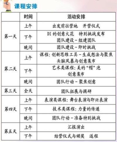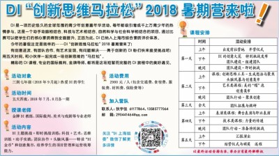 DI是一项历史悠久的全球范围的青少年创意嘉年华活动,每年都吸引着成千上万青少年的热情参与。这是一个动手动脑相结合、科技与艺术相结合、自然科学与社会科学相结合的项目,通过比赛可以使学生们的核心素质得到全面提升。正因为此,DI已纳入上海市综合素质评价体系。 今年的暑假注定是别样的——DI“创新思维马拉松”2018暑期营来了! 有创意迸发、有团队合作、有艺术呈现、有问题解决……勇于创新的DI粉们快来接受挑战吧!用五天时间,和小伙伴一起完成一场创新思维的“马拉松”。 精彩的DI课程、专业的国际裁判、金牌导师,都将是这场短暂而完整的DI旅程中的美好遇见。 活动对象 三到七年级(2018年9月起)热爱DI的学生 活动时间 五天四夜,2018年7月、8月各一期 授课老师 金牌DI教练、国际裁判、美术与戏剧等专业老师 活动内容 DI主题挑战+即时挑战训练;科技+艺术;思维训练+动手实践;团队协作+头脑风暴……特设“DI金币”和创意集市,培养学生的项目管理和运营统筹能力。 活动费用 2980元/人(包含交通费、食宿费、服装费、材料费、保险费等) 加入营队 联系人:狄宇佳 61177864、13585777064 邮 箱:290441464@qq.com 关注“DI上海组委”微信了解更多详情