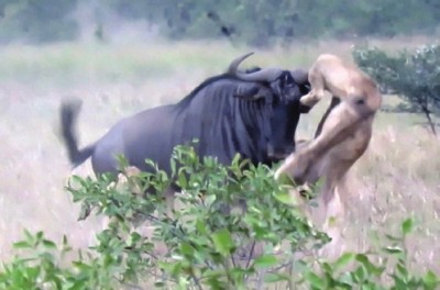 画面中,牛羚用牛角作为防御武器,用牛角钩住了其中一头母狮的后肢,并将其顶上了半空,以一己之力大战两头母狮,画面相当震撼。