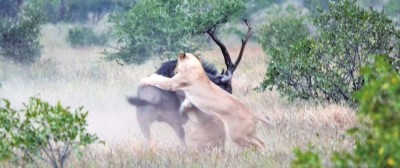 母狮抓住时机扑向牛羚,很快便将牛羚压制住了,眼看牛羚已在劫难逃,正在这时它快速地奋起反抗。