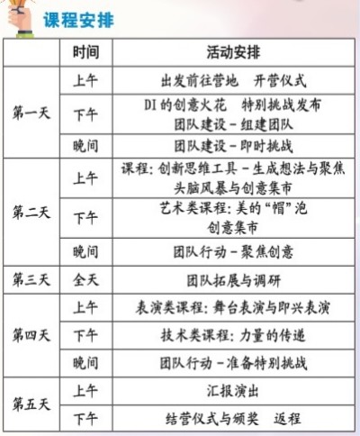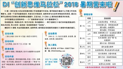 DI是一项历史悠久的全球范围的青少年创意嘉年华活动,每年都吸引着成千上万青少年的热情参与。这是一个动手动脑相结合、科技与艺术相结合、自然科学与社会科学相结合的项目,通过比赛可以使学生们的核心素质得到全面提升。正因为此,DI已纳入上海市综合素质评价体系。 今年的暑假注定是别样的——DI“创新思维马拉松”2018暑期营来了! 有创意迸发、有团队合作、有艺术呈现、有问题解决……勇于创新的DI粉们快来接受挑战吧!用五天时间,和小伙伴一起完成一场创新思维的“马拉松”。 精彩的DI课程、专业的国际裁判、金牌导师,都将是这场短暂而完整的DI旅程中的美好遇见。 活动对象 三到七年级(2018年9月起)热爱DI的学生 活动时间 五天四夜,2018年7月、8月各一期 授课老师 金牌DI教练、国际裁判、美术与戏剧等专业老师 活动内容 DI主题挑战+即时挑战训练;科技+艺术;思维训练+动手实践;团队协作+头脑风暴……特设“DI金币”和创意集市,培养学生的项目管理和运营统筹能力。 活动费用 2980元/人(包含交通费、食宿费、服装费、材料费、保险费等) 加入营队 联系人:狄宇佳 61177864、13585777064邮 箱:290441464@qq.com 关注“DI上海组委”微信了解更多详情