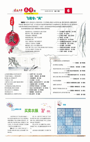编者按:飞花令,原本是古人行酒令时的一个文字游戏,源自古人的诗词之趣,得名于唐代诗人韩翃《寒食》中的名句“春城无处不飞花”。行飞花令时可选用诗词曲中的句子,但选择的句子一般不超过七个字。《中国诗词大会》等诗词综艺栏目也引进并改良了“飞花令”,选手在规定时间内说出含有规定关键字的诗句即可。 本栏目每周会推出飞花令,帮助同学们积累古诗词佳句。 我欲乘风归去,又恐琼楼玉宇,高处不胜寒 ——《水调歌头·丙辰中秋》 宋·苏轼 爆竹声中一岁除,春风送暖入屠苏 ——《元日》 宋·王安石 风雨送春归,飞雪迎春到 ——《卜算子·咏梅》 近代·毛泽东 等闲识得东风面,万紫千红总是春 ——《春日》 宋·朱熹 东风夜放花千树——《青玉案·元夕》 宋·辛弃疾 忽如一夜春风来,千树万树梨花开 ——《白雪歌送武判官归京》 唐·岑参 北国风光,千里冰封,万里雪飘 ——《沁园春·雪》 近代·毛泽东 骊宫高处入青云,仙乐风飘处处闻 ——《长恨歌》 唐·白居易 安得广厦千万间,大庇天下寒士俱欢颜,风雨不动安如山 ——《茅屋为秋风所破歌》 唐·杜甫 大江东去,浪淘尽,千古风流人物 ——《念奴娇·赤壁怀古》 宋·苏轼 已是黄昏独自愁,更著风和雨 ——《卜算子·咏梅》 宋·陆游 山河破碎风飘絮,身世浮沉雨打萍 ——《过零丁洋》 宋·文天祥 不知细叶谁裁出,二月春风似剪刀 ——《咏柳 / 柳枝词》 唐·贺知章 随风潜入夜,润物细无声 ——《春夜喜雨》 唐·杜甫 大风起兮云飞扬——《大风歌》 汉·刘邦 小楼昨夜又东风,故国不堪回首月明中 ——《虞美人·春花秋月何时了》 五代·李煜 塞下秋来风景异——《渔家傲·秋思》 宋·范仲淹 三杯两盏淡酒,怎敌他、晚来风急 ——《声声慢·寻寻觅觅》 宋·李清照 明月别枝惊鹊,清风半夜鸣蝉 ——《西江月·夜行黄沙道中》 宋·辛弃疾 风住尘香花已尽,日晚倦梳头 ——《武陵春·春晚》 宋·李清照 风吹草低见牛羊——《敕勒歌》 南北朝·佚名 箫鼓追随春社近,衣冠简朴古风存 ——《游山西村》 宋·陆游 云母屏风烛影深,长河渐落晓星沉 ——《嫦娥》 唐·李商隐 秋风萧瑟,洪波涌起——《观沧海 / 碣石篇》 汉·曹操 相见时难别亦难,东风无力百花残 ——《无题·相见时难别亦难》 唐·李商隐 毕竟西湖六月中,风光不与四时同 ——《晓出净慈寺送林子方》 宋·杨万里 春风又绿江南岸,明月何时照我还 ——《泊船瓜洲》 宋·王安石 昨夜西风凋碧树——《蝶恋花·槛菊愁烟兰泣露》 宋·晏殊 杨柳岸,晓风残月 ——《雨霖铃·寒蝉凄切》 宋·柳永 便纵有千种风情,更与何人说 ——《雨霖铃·寒蝉凄切》 宋·柳永 洛阳城里见秋风,欲作家书意万重 ——《秋思》 唐·张籍