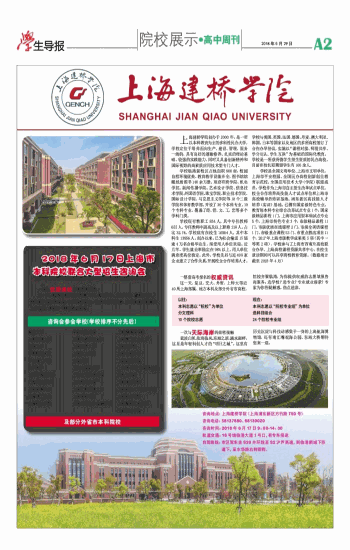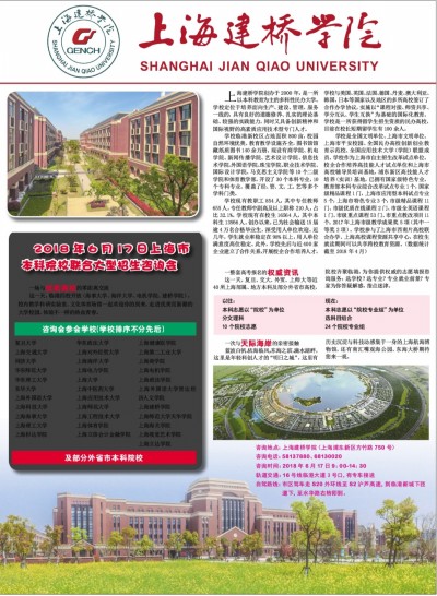 上海建桥学院创办于2000年,是一所以本科教育为主的多科性民办大学。 学校定位于培养面向生产、建设、管理、服务一线的,具有良好的道德修养、扎实的理论基础、较强的实践能力,同时又具备创新精神和国际视野的高素质应用技术型专门人才。 学校临港新校区占地面积800亩,校园自然环境优美、教育教学设施齐全,图书馆馆藏纸质图书140余万册。现设有商学院、机电学院、新闻传播学院、艺术设计学院、信息技术学院、外国语学院、珠宝学院、职业技术学院、国际设计学院、马克思主义学院等10个二级学院和体育教学部,开设了30个本科专业,10个专科专业。覆盖了经、管、文、工、艺等多个学科门类。 学校现有教职工854人,其中专任教师655人,专任教师中副高及以上职称210人,占比32.1%。学校现有在校生16564人,其中本科生13956人。创办以来,已为社会输送15届逾4万名合格毕业生,深受用人单位欢迎。近几年, 学生就业率稳定在98%以上,用人单位满意度高位稳定。此外,学校先后与近400家企业建立了合作关系,开展校企合作培养人才。学校与美国、英国、法国、德国、丹麦、澳大利亚、韩国、日本等国家以及地区的多所高校签订了合作办学协议,实施以“课程对接、师资共享、学分互认、学生互换”为基础的国际化教育。学校是一所获得留学生招生资质的民办高校,目前在校长短期留学生有100余人。 学校是全国文明单位、上海市文明单位、上海市平安校园、全国民办高校创新创业教育示范校、全国应用技术大学(学院)联盟成员。学校作为上海市自主招生改革试点单位、校企合作培养高技能人才试点单位和上海市高校辅导员培训基地、浦东新区高技能人才培养(实训)基地,已拥有国家级特色专业、教育部本科专业综合改革试点专业1个,国家级精品课程1门,上海市应用型本科试点专业5个,上海市特色专业3个,市级精品课程11门、市级优质在线课程2门、市级全英语课程1门、市级重点课程53门、市重点教改项目11个。2017年上海市级教学成果奖5项(其中一等奖2项)。学校参与了上海市西南片高校联合办学、上海高校课程资源共享中心,在校生就读期间可以共享跨校教育资源。(数据统计截至2018年4月) 一整套高考报名的权威资讯 这一天,复旦、交大、外贸、上师大等近40所上海部属、地方本科及部分外省市高校,院校齐聚临港,为你提供权威的志愿填报咨询服务:选学校?选专业?专业就业前景?专家为你答疑解惑,指点迷津。 以往: 本科志愿以“院校”为单位 分文理科 10个院校志愿 现在: 本科志愿以“院校专业组”为单位 选科目组合 24个院校专业组 一次与天际海岸的亲密接触 蓝波白帆、依海临风,东海之滨、滴水湖畔,这里是年轻科创人才的“明日之城”,这里有历史沉淀与科技动感集于一身的上海航海博物馆,还有南汇嘴观海公园、东海大桥期待您来一观。 2018年6月17日上海市本科院校联合大型招生咨询会 一场与优质高校的零距离交流 这一天,临港四校开放(海事大学、海洋大学、电机学院、建桥学院),校内教学科研实验室、文化体育场馆一起欢迎你的到来,走进优美而新潮的大学校园,体验不一样的热血青春。 咨询会参会学校(学校排序不分先后) 复旦大学 上海交通大学 同济大学 华东师范大学 华东理工大学 东华大学 上海外国语大学 上海科技大学 上海海事大学 上海理工大学 上海杉达学院 华东政法大学 上海对外经贸大学 上海海洋大学 上海电力学院 上海大学 上海中医药大学 上海应用技术大学 上海师范大学 上海工程技术大学 上海体育学院 上海立信会计金融学院 上海健康医学院 上海第二工业大学 上海商学院 上海电机学院 上海政法学院 上海外国语大学贤达经 济人文学院 上海建桥学院 上海师范大学天华学院 上海海关学院 上海视觉艺术学院 上海立达学院 及部分外省市本科院校 咨询地点:上海建桥学院(上海浦东新区方竹路750号) 咨询电话:58137880、68130020 咨询时间:2018年6月17日9:00-14:30 轨道交通:16号线临港大道3号口,有专车接送 自驾路线:市区驾车走S20外环线至S2沪芦高速,到临港新城下匝 道下,至水华路右转即到。