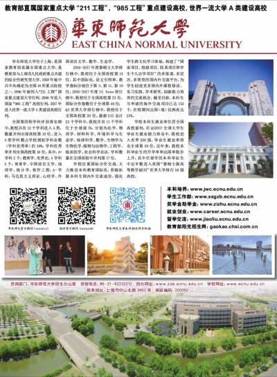 教育部直属国家重点大学“211工程”、“985工程”重点建设高校、世界一流大学A类建设高校 华东师范大学位于上海,是国家教育部直属全国重点大学,是教育部与上海市人民政府重点共建的综合性研究型大学。1959年被中共中央确定为全国16所重点院校之一,1996年被列入“211工程”国家重点建设大学行列,2006年进入国家“985工程”高校行列,2017年进入世界一流大学A类建设高校行列。 全国第四轮学科评估排名榜中,我校共有12个学科进入A类,数量并列全国高校第19位。进入A类学科数占学校授权学科总数(学科优秀率)的30%,学科优秀率并列全国高校第16位。其中,A+学科2个:教育学、世界史;A学科5个:体育学、 中国语言文学、地理学、 统计学、软件工程;A-学科:马克思主义理论、心理学、外国语言文学、数学、生态学。 2016-2017年度泰晤士大学排行榜中,我校位于全国高校第14位,其中国际化、论文引用率、教学指标分别位于第5、第11、第19位;2016-2017年度US News排行榜中,我校位于全国高校第23位,国际合作指数位于全球第40位;QS世界大学排行榜中,我校位于全国高校第20位。最新ESI总计22个学科中,我校共有11个学科位于全球前1%,分别为化学、物理学、材料科学、环境科学与生态学、地球科学、数学、生物学与生物化学、植物与动物学、工程学、临床医学、社会科学总论,学科数量在全国高校中并列第17位。 学校注重国际合作交流,大力推进本科教育国际化,积极拓展本科生国内外交流途径,强化学生跨文化学习体验。构建了“国家项目、校级项目、院系项目和学生个人访学项目”的多渠道、多层次、多类型的国内外交流平台,为学生创造更多国内外课程修读、实习实践、学术研究、创新能力培养的交流机会。截至目前,本科生可申请的海外交流项目已达152个,在校期间出国(境)比例高达25%。 学校本科生就业率位居全国高校前列,在QS2017全球大学生毕业生就业能力排名中,我校进入世界200强,毕业生就业率排名全球第59位。近年来,我校本科毕业生的升学率和出国率稳步上升,其中在留学的本科毕业生中近半数进入英国“泰晤士报高等教学副刊”世界大学排行50强高校。 本科培养:www.jwc.ecnu.edu.cn 学生工作部:www.xsgzb.ecnu.edu.cn 奖学金助学金:www.zizhu.ecnu.edu.cn 就业创业:www.career.ecnu.edu.cn 留学交流:www.jiaoliu.ecnu.edu.cn 教育部阳光招生网:gaokao.chsi.com.cn 咨询部门:华东师范大学招生办公室 咨询电话:86-21-62232212 招办网址:www.zsb.ecnu.edu.cn 学校网址:www.ecnu.edu.cn 联系地址:上海市中山北路3663号 邮政编码:200062