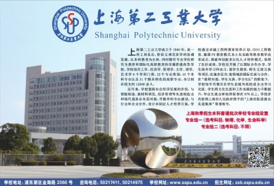 上海第二工业大学成立于1960年,是一所工科见长,管经文理艺多学科协调发展,以本科教育为主体, 同时拥有专业学位研究生教育和国际化高职教育的市属普通高等学校。学校现有工学、经济学、管理学、文学、理学、艺术学6个学科门类,22个专业类别,43个本科专业以及31个颇具特色的高职专业,全日制在校生约12000余人。 近年来,学校紧跟社会经济发展的步伐,与智能制造、新材料研发、经济管理等先进制造业和现代服务业全面对接,开展学科专业建设;与行业和企业合作,设计并制定人才培养方案。学校通过卓越工程师教育培养计划、CDIO工程教育、德国FH教育模式本土化实践等教育教学改革试点,探索和创新多元化人才培养模式,取得了良好成效。学校还开展了以国际合作办学、学生海外学习和实习、留学生教育、师生互派互换等项目,实施多层次、宽领域的国际交流与合作。在“课程对接、学生互换、学分互认”的框架下,学校每年有数百名学生赴境外高校或企业学习交流,学生跨文化交流和工作实践的能力不断提升。毕业生就业率始终保持在97%以上,学校多次获得上海市人民政府授予的“上海市促进就业先进集体”荣誉称号。 上海秋季招生本科普通批次学校专业组设置 专业组一(选考科目:物理、化学、生命科学) 专业组二(选考科目:不限) 学校地址:浦东新区金海路2360号 咨询电话:50217411、50214975 学校网址:www.sspu.edu.cn 招生网址:zsb.sspu.edu.cn