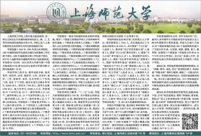上海师范大学是上海市重点建设高校,是一所以文科见长并具教师教育特色的文、理、工、艺等学科协调发展的综合性大学。学校已进入上海市教育综合改革部市共同支持的高校行列。 学校创建于1954年,1956年成为本科院校,1981年被国务院学位委员会确定为首批硕士学位授予单位,1986年被批准为博士学位授予单位,2017年入选教育部卓越教师培养计划实施院校。学校排名USNEWS 2018世界大学排行榜(中国内地高校)73位,排名QS2018亚洲大学排行榜(中国内地高校)59位。 学校学科门类齐全,教学成果丰硕。现有哲学、经济学、法学、教育学、文学、历史学、理学、工学、管理学、农学、艺术学等11个学科门类。设有17个学院,拥有在读全日制本科学生20000多人,研究生7700多人,留学生总数2700多人,夜大学学生12000人左右。学校现设87个本科专业;29个一级学科硕士点,161个二级学科硕士点,13个专业学位硕士点;6个一级学科博士点,46个二级学科博士点,9个博士后流动站。学校现有1个国家重点学科;11个上海市重点学科;11个学科进入上海市高峰高原学科,入选学科数位居上海市属高校第二;4个教育部高等学校特色专业建设点;1个教育部和上海市本科专业综合改革试点专业;2个教育部卓越教师培养计划改革项目;4个上海市属高校应用型本科试点专业建设项目;18个上海市本科教育高地建设项目。3个学科进入ESI前1%学科。 学校拥有一批实力较强的实验室和科研基地。现有1个国家文科基础学科人才培养和科学研究基地;1个国家重点培养人才基地;1个教育部人文社会科学重点研究基地;1个教育部国际教育研究培育基地;1个教育部区域与国别研究培育基地;1个教育部重点实验室;1个教育部国际合作联合实验室;1个教育部国际合作与交流司备案的国别和区域研究中心;1个上海高校智库;2个上海市重点实验室;2个上海高校重点实验室;1个上海市工程技术研究中心;1个上海市协同创新中心;12个上海市人文社科研究和决策咨询基地;4个上海市高校E-研究院;1个上海市卓越新闻传播人才培养基地。2017年,联合国教科文组织二类机构“教师教育中心”落户学校,进一步提升学校教师教育的全球影响力。学校主办或承办25种学术期刊,其中《高等学校文科学术文摘》是全国三大社会科学文摘期刊之一。 学校科研实力雄厚。“十二五”以来,学校共获得国家级项目548项,其中国家社科基金重大招标项目24项,教育部哲学社会科学研究重大课题攻关项目6项,国家哲学社会科学成果文库4项,国家重点研发计划课题7项(含子课题5项),国家科技支撑计划4项,国家自然科学基金重点项目6项(含2项合作),国家自然科学基金重大研究计划项目1项;各类省部级项目792项。获得省部级及以上优秀成果奖励118项,其中教育部高等学校科学研究优秀成果奖(人文社会科学类) 11项。2017年学校各类国家社科基金和教育部人文社科项目立项数分别排名全国第12位和第9位。 学校师资队伍结构合理,优秀拔尖人才辈出。现有教职员工2925人,具有副高及以上专业技术职务人员1094人,其中国家“千人计划”入选者2人,教育部“长江学者奖励计划”入选者3人,国家“万人计划”教学名师1人,国家“万人计划”青年拔尖人才1人,国家教学名师入选者3人,国家“杰出青年科学基金”获得者4人,国家“优秀青年基金”获得者6人,人社部“新世纪百千万人才工程”国家级人选5人,教育部“新世纪优秀人才支持计划”17人以及上海市“东方学者”入选者26人,上海领军人才2人,上海市“千人计划”入选者5人,青年“东方学者”5人,上海市优秀学科带头人计划入选者9人,上海市“曙光计划”人才入选者42人,上海市“浦江人才”计划入选者56人,上海市青年拔尖人才2人,上海市青年科技启明星计划入选者30人,上海市青年科技英才“扬帆计划”入选者13人,上海市“晨光计划”入选者26人,上海市“阳光计划”入选者21人等。此外,学校还组建了一支500余人的兼职教师队伍。 学校办学资源丰富。现有徐汇和奉贤两个校区, 占地面积153万多平方米。校舍建筑面积65万多平方米。两个中心图书馆藏书305余万册;有100多个电子文献数据库和8个具有馆藏特色的自建数据库;馆藏古籍约18万册,善本古籍1350多种,于2009年被授予“全国古籍重点保护单位”。建在学校的上海高校瓷器艺术博物馆是上海市十大高校民族文化博物馆之一。 学校重视国际化办学,对外交流合作广泛。被列入来华留学生中国政府奖学金院校以及上海市外国留学生预科基地。学校与全球六大洲40多个国家和地区的近400个高校和组织建立了交流合作关系。与美国、英国、德国、荷兰、俄罗斯、法国等六个国家的7所高校合作举办10个中外合作办学项目。在日本广岛福山大学、非洲博茨瓦纳大学和美国密苏里大学建有三所孔子学院。 建校以来,学校始终秉承情系教育的理念,在“厚德、博学、求是、笃行”校训的引领下,传承弘扬“师道永恒”的师大精神,涌现了一大批名师大家。同时,学校培养的毕业生,活跃在基础教育的一线,其中有上海市教育功臣、中小学特级校长和特级教师,他们以高尚的师德和卓然的成绩,不断拓展深化着师大教师教育的文化根基和精神血脉。 面向未来,学校将继续贯彻“特色、创新、协调、开放、共享”的发展理念,秉持“厚基础、重实践、国际化”的人才培养理念和“价