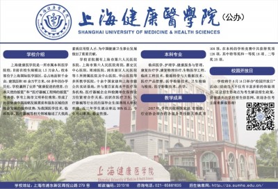 学校介绍 上海健康医学院是一所市属本科医学院校,目前在校生规模达1.5万余人,校本部位于上海国际医学园区,总占地面积千余亩,建筑面积60余万平方米。60多年的办学历史,学校赢得了业界“健康促进的使者,白衣天使的摇篮”和“医疗器械工程师的摇篮”等美誉,享有上海市文明单位殊荣,形成了对接健康中国战略发展需求和服务区域经济社会发展的独特优势,为我国医学技术、临床医学、医疗器械等相关领域输送了大批高素质应用型人才,为中国健康卫生事业发展做出了重要贡献。 学校首批拥有上海市第六人民医院东院、上海市第六人民医院南院、嘉定区中心医院、周浦医院、浦东新区人民医院等5所附属医院及中山医院、华山医院等多所教学医院,十余个国家级和上海市级公共实训基地,并与数百家高水平医疗服务机构、医疗器械企业和检测单位保持全方位紧密合作关系。活跃在医疗卫生、医疗器械等行业的历届毕业生深得用人单位欢迎,近三年学生就业率达98%以上,专业对口率高、稳定性强。 本科专业 临床医学、护理学、健康服务与管理、康复治疗学、康复物理治疗、生物医学工程、临床工程技术、数据科学与大数据技术、医疗产品管理、医学检验技术、卫生检验与检疫、医学影像技术、药学。 教学成果 2017年,学校共取得国家级、省部级、行业协会举办的各级各类技能大赛奖项168项。在本科的学科竞赛中共获得奖项126项,其中特等奖和一等奖18项,二等奖25项。 校园开放日 学校将于6月14日举办“校园开放日”活动,活动当天不仅有丰富多彩的体验项目,还设招生咨询点为考生解读招生政策,详情请关注学校招生信息网。欢迎各位考生前来参观咨询! 学校地址:上海市浦东新区周祝公路279号 邮政编码:201318 咨询电话:021-65881635 招生信息网:http://zs.sumhs.edu.cn/