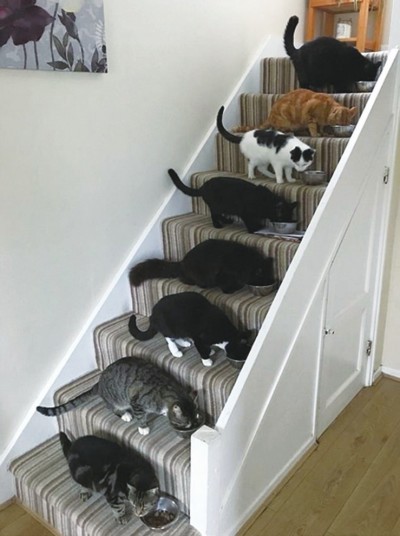 一天晚饭时间,她把八份猫食分别放在八级楼梯上,成功吸引了家中八只小猫。只见它们乖乖地趴在楼梯上进食,这才有了这张可爱憨萌的照片。