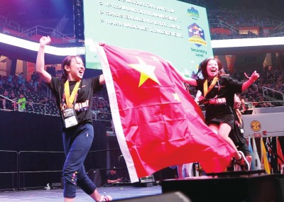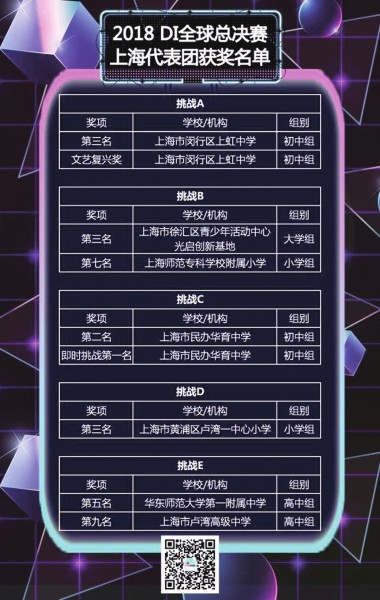 美国当地时间5月26日下午,为期四天的2018DI全球赛在美国田纳西州立大学完美落幕。在这场有19个国家、1600多支参赛队伍、2万余名学生参与的DI全球赛中,上海代表团表现不俗,在参与的挑战A至挑战E这五个项目中均有所斩获,共获得9项大奖,包括一个第二名、三个第三名、两个特别奖,以及三个第四至第十名。 文/特派记者 周胜洁 【战果累累】 卢湾一中心小学首战获挑战D小学组第三 闵行区上虹中学是上海代表团中第一个得奖的,他们获得技术类挑战A初中组第三名,并一举获得挑战A的文艺复兴特别大奖。 上海市民办华育中学参加的是艺术类挑战C“变调的音乐剧”,此次获得挑战C初中组第二名,同时获得该项目即时挑战第一名,两次站上了世界的领奖台。另外,今年首次参加DI全球赛的黄浦 区卢湾一中心小学“群星闪耀队”凭借自己的实力和努力,获得挑战D小学组第三名。上海师范专科学校附属小学获得挑战B小学组第七名。 由于比赛结果事先无人知晓,均是在闭幕式现场当场宣布,各国孩子们听到自己的好成绩时,惊讶、激动伴随着笑容、泪水,通过大屏幕真实传递给了现场所有人。 【比赛趣闻】 “关键姑娘”启动装置 表演担当妙改道具 第一天比赛中,参与挑战A的上海师范大学附属卢湾实验小学有一位“关键姑娘”——杜奕婷。 他们演绎了一出将仇恨星球转换成爱心星球的故事。杜奕婷和队友扮演2位爱心天使,他们的变形物是一台爱心搜索装置,需要通过仙女棒触动开关,高尔夫球滚动促使装置“变身”,“蹦”出一颗大爱心。 现场,队友挥动了3次仙女棒,都没有成功触动开关,看到队友越来越急迫的眼神,站在一旁的杜奕婷临时变通,接着队友的戏,她俯下身,用手动方式帮助球触动开关,装置顺利蹦出了爱心,大家都松了一口气。 “当时我也挺急的,要帮忙也要做得很自然,要让评委觉得,我们是有意将剧情这么安排的。” 另一名扮演仇恨怪的薛一土,表演前他的重要道具剪刀出现突发状况,剪刀衔接处的材料脱落,导致还没开场,剪刀就一分为二了。 修道具是来不及了,薛一土灵机一动,全程捏着剪刀衔接处进行表演,最后仇恨怪被感动时将剪刀砸向地上,剪刀自然一分为二,“我觉得仇恨怪经历了从生气、暴怒到伤心、平静的过程,剪刀分成两半更能表达这种心情。” 薛一土在台上表演张力十足,引得国外友人追到道具准备区,称赞他是“great actor”。 谁又想,台下他是团队里的团宠小哭包,因为对自己要求高,性格又急切,常常因为达不到要求而哭,最近一次掉眼泪是因为搓纸棍没搓好而急哭了。不过加入DI两年,薛一土已经从每天一哭转变为了每周一哭,“在团队里协作能力提高了,也有榜样的力量,都会帮助他成长。”学校带队老师费宏斌对此也很认可。