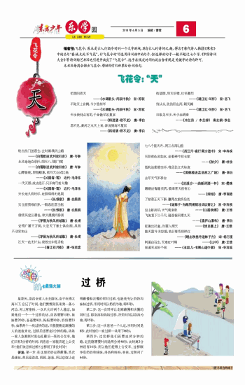 编者按:飞花令,原本是古人行酒令时的一个文字游戏,源自古人的诗词之趣,得名于唐代诗人韩翃《寒食》中的名句“春城无处不飞花”。行飞花令时可选用诗词曲中的句子,但选择的句子一般不超过七个字。《中国诗词大会》等诗词综艺栏目也引进并改良了“飞花令”,选手在规定时间内说出含有规定关键字的诗句即可。 本栏目每周会推出飞花令,帮助同学们积累古诗词佳句。 把酒问青天 ——《水调歌头·丙辰中秋》 宋·苏轼 不知天上宫阙,今夕是何年 ——《水调歌头·丙辰中秋》 宋·苏轼 天生我材必有用,千金散尽还复来——《将进酒·君不见》 唐·李白 君不见,黄河之水天上来,奔流到海不复回 ——《将进酒·君不见》 唐·李白 抬望眼、仰天长啸,壮怀激烈——《满江红·写怀》 宋·岳飞 待从头、收拾旧山河,朝天阙——《满江红·写怀》 宋·岳飞 归来见天子,天子坐明堂——《木兰诗 / 木兰辞》 南北朝·佚名 轮台东门送君去,去时雪满天山路 ——《白雪歌送武判官归京》 唐·岑参 北风卷地白草折,胡天八月即飞雪 ——《白雪歌送武判官归京》 唐·岑参 山舞银蛇,原驰蜡象,欲与天公试比高 ——《沁园春·雪》 近代·毛泽东 一代天骄,成吉思汗,只识弯弓射大雕 ——《沁园春·雪》 近代·毛泽东 天长地久有时尽,此恨绵绵无绝期 ——《长恨歌》 唐·白居易 天生丽质难自弃,一朝选在君王侧 ——《长恨歌》 唐·白居易 俄顷风定云墨色,秋天漠漠向昏黑 ——《茅屋为秋风所破歌》 唐·杜甫 安得广厦千万间,大庇天下寒士俱欢颜,风雨不动安如山 ——《茅屋为秋风所破歌》 唐·杜甫 江天一色无纤尘,皎皎空中孤月轮 ——《春江花月夜》 唐·张若虚 七八个星天外,两三点雨山前 ——《西江月·夜行黄沙道中》 宋·辛弃疾 天阶夜色凉如水,坐看牵牛织女家 ——《秋夕》 唐·杜牧 孤帆远影碧空尽,唯见长江天际流 ——《黄鹤楼送孟浩然之广陵》 唐·李白 去年天气旧亭台——《浣溪沙·一曲新词酒一杯》 宋·晏殊 嫦娥应悔偷灵药,碧海青天夜夜心 ——《嫦娥》 唐·李商隐 了却君王天下事,赢得生前身后名 ——《破阵子·为陈同甫赋壮词以寄之》 宋·辛弃疾 空山新雨后,天气晚来秋 ——《山居秋暝》 唐·王维 飞流直下三千尺,疑是银河落九天 ——《望庐山瀑布》 唐·李白 征蓬出汉塞,归雁入胡天 ——《使至塞上》 唐·王维 接天莲叶无穷碧,映日荷花别样红 ——《晓出净慈寺送林子方》 宋·杨万里 荆溪白石出,天寒红叶稀 ——《山中》 唐·王维 却道天凉好个秋 ——《丑奴儿·书博山道中壁》 宋·辛弃疾