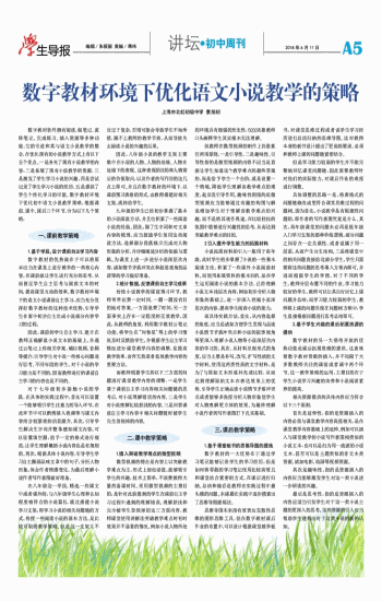 数字教材软件拥有阅读、做笔记、流转笔记、完成练习、插入资源等多种功能,它的引进和其与语文小说教学的整合,在优化现有的小说教学方式上有以下五个优点。一是补充了现有小说教学的内容,二是拓展了现有小说教学的资源,三是激发了学生学习小说的兴趣,四是尝试记录了学生学习小说的经历,五是提供了学生个性化学习的可能。数字教材环境下优化初中语文小说教学策略,根据课前、课中、课后三个环节,分为以下几个策略: 一、课前教学策略 1.基于学段,设计课前自主学习内容数字教材的优势就在于可以将原本应当在课堂上进行教学的一些核心内容,在课前就让学生进行充分的思考,从而留足学生自主思考与阅读文本的时间,提高课堂互动的效率。数字教材环境下的语文小说课前自主学习,应当充分发挥好数字教材的这种技术优势,引导学生在家中初步自主完成小说部分内容学习的过程。 因此,课前的学生自主学习,建立在教师正确解读小说文本的基础上,并通过云笔记上传相关学案,辅以视频、音频等媒介,引导学生对小说一些核心问题进行思考。不同年段的学生,对于小说的学习能力是不同的,因而教师进行的课前自主学习的内容也是不同的。 对于七年级初步接触小说的学段,在具体的实践过程中,首先可以设置一个能够吸引学生注意力的导入环节,在此环节中可以酌情插入视频等与课文内容结合较紧密的信息媒介。其次,引导学生解决生字词并整体感知课文内容,可以设置填空题,给予一定的格式进行规范,让学生理解概括小说内容也是有规则的。再次,根据具体小说内容,引导学生学习自主圈画品味文章中的句子,分析人物形象,体会作者情感变化,为最后理解小说作者写作意图做好准备。 在八年级这一学段,精选一些课文中或者课外的,与八年级学生心理和认知程度相符合的小说篇目,通过搭建小说学习支架,即学习小说的相关问题链的方式,传授一些阅读小说的基本方法,是比较可取的教学策略。但是这一支架又不宜过于复杂,否则可能会导致学生不知所措,跟不上教师的教学节奏,从而导致失去阅读小说的兴趣的后果。 因此,八年级小说的教学支架主要集中在小说的人物、人物的处境、人物在处境下的表现、这种表现的目的和人物背后的价值取向,以及作者的写作目的这几点上即可。并且在数字教材的环境下,以课前预习表格的形式,由教师搭建好相关支架,流转给学生。 九年级的学生已经初步掌握了基本的小说阅读方法,并且也积累了一些阅读小说的经验。因此,除了生字词和对文章内容的梳理,应当鼓励学生使用这些阅读方法,选择部分段落独立完成对人物形象的分析,并详细阐述分析的依据与逻辑。为课堂上进一步进行小说深层次内容,诸如情节矛盾冲突点和叙述视角的品读等的学习做好准备。 2.统计数据,反馈课前自主学习成果传统小说教学的课前预习环节,教师常常花费一定时间,一题一题没有目的地对答案。一方面浪费了时间,另一方面事实上存在一定程度的无效教学。因此,从教师的角度,利用数字教材云笔记功能,将学生在“问卷星”等上的学习情况及时反馈给学生,并根据学生自主学习情况进行课堂教学内容的调整,是提高教学效率,舍弃无效或者低效教学内容的重要方法。 而教师根据学生的以下三方面的问题进行课堂教学内容的调整:一是学生基于课前自主学习内容相关问题链的思考后,对小说理解错误的内容。二是学生对小说理解比较肤浅的内容。三是回答课前自主学习内容中相关问题链时被学生完全忽视掉的内容。 二、课中教学策略 1.插入突破教学难点的微型视频 微型视频的特点是内容上以突破教学难点为主,形式上轻松活泼,能够吸引学生的兴趣,技术上简单,不浪费教师大量的备课时间。采用微型视频的主要目的,是针对此前提到的学生在课前自主学习过程中遇到的理解错误、理解肤浅和完全被学生忽视掉的这三方面内容,教师课堂使用讲解法突破教学难点时有时效果并不显著的情况。例如小说人物所处的环境具有极强的历史性,仅仅依靠教师口头阐释学生其实根本无法理解。 但教师在微型视频的制作上仍需抓住两项原则,一是引导性,二是趣味性。引导性指的是微型视频的内容不应当是直接让学生知道这个教学难点的最终答案的,而是给予学生一个台阶,或是设置一个情境,降低学生理解该教学难点的难度,起启发引导作用。趣味性则指的是微型视频应当能够通过有趣的构图与解说增加学生对于理解该教学难点的兴趣,而不是将其视作畏途,在比较轻松的氛围中能够进行兴趣性的思考,从而达到突破教学难点的目的。 2.引入提升学生能力的拓展材料 小说拓展材料的引入一般用于高年级,此时学生初步掌握了小说的一些基本阅读方法,积累了一些课外小说阅读材料。而使用拓展资料的根本目的,是在学生运用阅读小说的基本方法,已经理解小说文本浅层次内容,例如初步分析人物形象的基础上,进一步深入挖掘小说深层次的内容,提高学生阅读小说的能力。 而具体实践方法,首先,从内容选择的角度,应当是诸如方便学生发现与品读小说情节矛盾冲突点和小说的叙事视角等更深入理解小说人物等小说深层次内容的学习的。其次,从材料呈现形式的角度,应当主要是补写、改写、扩写性质的文字材料。使用这两类性质的