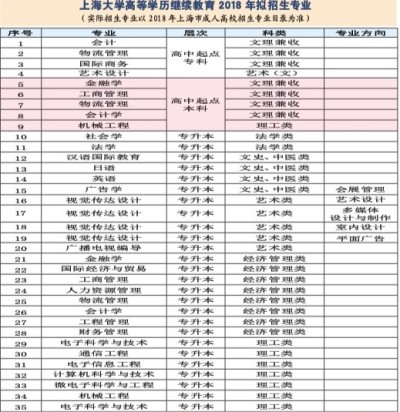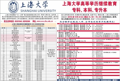 上海大学高等学历继续教育 专科、本科、专升本 上海大学是国家“211工程”重点建设的综合性大学,学科门类齐全。近年来,上海大学继续教育学院依托学校的学科优势及雄厚的师资力量,曾先后荣获上海和全国成人高等学校招生工作先进集体及上海市成人教育先进集体等荣誉称号。2018年成人高考报名在即,为帮助考生解读政策、选择专业、填报志愿,上海大学继续教育学院将于2018年6月24日(周日)9:00—15:00在校本部延长、新闸、宝山和嘉定校区同时举办招生咨询活动,欢迎广大考生来校咨询。 为方便学生就近入学,全市各区设有多处教学点! 上海大学校本部 上海大学延长校区:静安区 延长路149号 Tel: 56331940 上海大学新闸校区:静安区 新闸路1220号 Tel:62156093 上海大学宝山校区:宝山区 锦秋路716号 Tel:66136290 上海大学嘉定校区:嘉定区 城中路20号 Tel:69982965 轨交1号线 静安区 阳曲路421号 Tel: 66972632 徐汇区 漕溪北路502号 Tel:64863973(另有轨交4、9号线) 黄浦区 北海路8号18楼 Tel:64375381(另有轨交2、8、10号线) 黄浦区 汉口路515号702室Tel:63528705(另有轨交2、8、10号线) 轨交2号线 长宁区 江苏北路89号 Tel:17765100998(另有轨交1 1号线) 浦东新区 川沙新镇川环南路266号 Tel: 58925906 轨交3号线 虹口区 丰镇路122号 Tel: 65259804 普陀区 曹杨路805号 Tel: 62541 1 70(另有轨交4、1 1号线) 轨交5号线 闵行区 雅致路215号六楼 Tel:34121690(另有轨交1号线) 轨交6号线 浦东新区 商城路1980号 Tel:60546100 浦东新区 浦东南路1630号 -3 Tel:68671 1 12(另有轨交4号线) 浦东新区 大同路479号 Tel:58610450 浦东新区 兰城路303号 Tel: 50384121 浦东新区 金桥路150号 Tel: 50381946 轨交7号线 宝山区 大华三路99号 Tel:36533260 轨交8号线 浦东新区 德州路240号 Tel:68325814(另有轨交6、7号线) 杨浦区 大连路846号 Tel: 65045610 轨交9号线 松江区 秀水新路21号 Tel:57822906 闵行区 宝南路533号 Tel:60341268 轨交11号线 嘉定区 安亭镇于塘路885号 Tel:69576687 轨交13号线 嘉定区 江桥镇华江路856号 Tel:69992193 其他还有: 青浦区 公园路408号3楼Tel:69217528 浦东新区 南汇勤奋路21号 Tel:31038636 校本部考前辅导电话:56331940、62156093、69982965(嘉定) 招生咨询电话:56331940、62552368 网址:www.cce.shu.edu.cn