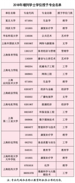 市教委近日发布,经学校申报、专家评议和上海市学位委员会审核,批准13所高校的21个专业增列为学士学位授予专业,包括复旦大学的生态学、同济大学的康复治疗学、华东师范大学的公共艺术、上海外国语大学的网络与新媒体等。具体如下: