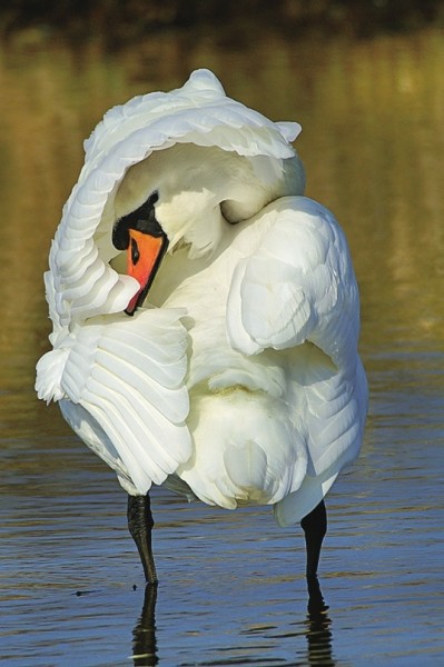 一只天鹅发现摄影师正等着给它拍照,害羞地赶紧把脸藏在翅膀下面,尽管如此它还是没能躲过镜头。