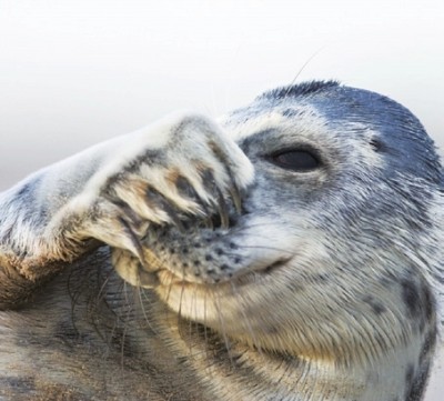 一只灰海豹超级害羞,用手捂脸不敢面对镜头。