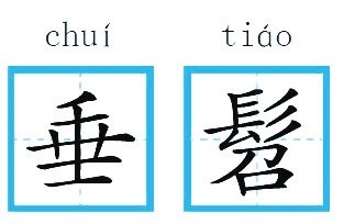 释义 小孩子头发下垂的样子,后引申为儿童或者童年的意思。 辨析 “髫”容易和“髻”(jì)弄混。前者专门用于孩童,而且是用来形容头发下垂的样子;而后者主要用于“发髻”,指盘在头顶或脑后的发结。清代袁枚《祭妹文》“汝梳双髻”,指的就是妹妹头上梳着两个发结。其实“召”和“吉”用于表声,根据读音便不会将这两个字写错。 起源与演变 “髫”从髟(biāo),“髟”为长发下垂的样子。《说文解字》对“髫”的解释为“小儿垂结也”。指的是古时候小孩前额下垂的头发,后来引申为儿童或者童年。清代戴名世《姚符御诗序》“与余垂髫相识,稍长,各游学四方”,说的便是小时候就相识了,等长大一些,便各自游学。