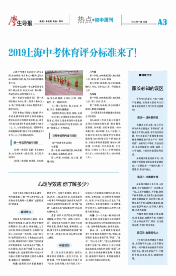 上海中考体育共计30分,分分易得,分分珍贵。体育考试一般从4月初开始,持续到5月初,每个区的考试安排略有不同。 体育考试由统一考试和日常考核两个部分组成,总分为30分。其中统一考试为15分,日常考核为15分。 统一考试分设四类项目:第一类项目满分为6分,第二类项目满分为3分,第三类项目满分为3分,第四类项目满分为3分。 日常考核由《体育与健身》学科考试成绩和《国家学生体质健康标准》综合评定结果两部分组成。其中《体育与健身》考试成绩满分为6分(七、八、九年级各为2分),《国家学生体质健康标准》综合评定结果满分为9分(七、八、九年级各为3分)。 统一考试的内容与项目 (1)第一类项目:长跑(男生1000米,女生800米);游泳(男、女生均为200米) (2)第二类项目:50米跑、立定跳远、实心球、跳绳、引体向上(男)、仰卧起坐(女)、游泳(25米) (3)第三类项目:垫上运动、单杠、双杠、横箱分腿腾越 (4)第四类项目:篮球、排球、足球每位考生必须参加全部4类项目的考试。可在上述各类项目中各选择一个自己擅长的项目作为考试项目,项目一经选定后,不得更改。 日常考核的内容与项目 (1)平时体育考试项目 七年级 第一学期:1000米跑(男),800米跑(女),跳高,支撑跳跃,武术 第二学期:50米跑,实心球,跳绳,双杠 八年级 第一学期:1000米跑(男),800米跑(女),跳远,垫上运动,篮球 第二学期:50米跑,实心球(原地侧向),单杠,引体向上(男),仰卧起坐(女) 九年级 第一学期:1000米跑(男),800米跑(女),垫上运动,武术 第二学期:50米跑,实心球(侧向移动),横箱分腿腾越 (2)《国家学生体质健康标准》综合评定项目 2016届初三毕业生其七年级评定项目为身高标准体重,肺活量体重指数,50米跑,坐位体前屈,1000米跑(男),800米跑(女);八年级、九年级评定项目为《国家学生体质健康标准(2014年修订)》中的规定项目,分别为身体质量指数(BMI),肺活量,50米跑,坐位体前屈,立定跳远,引体向上(男),1分钟仰卧起坐(女),1000米跑(男),800米跑(女)。