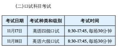 2018年下半年全国大学英语四、六级考试的笔试和口试将分别于12月15日(星期六)和11月17日(星期六)至18日(星期日)举行。上海地区报名工作于9月下旬开始。
