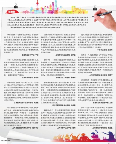 2018年,“厉害了,我的国”——上海市中等职业学校学生庆祝改革开放40周年系列活动,在全市中职校展开。该活动由青年报社、上海教育系统关工委中职分会、上海市中小学德育研究协会中职德育专委会、上海市职业教育协会中职德育工作委员会等主办,共分“美丽了,我的城”H5制作、“我的未来之城”明信片设计、“你好,2035”征文演讲三大板块。其中,征文演讲活动,在经过几轮评选后,12篇获得征文一等奖的作品入围演讲环节,演讲活动将于11月9日在上海市材料工程学校举行。 我们特别选摘了12篇文章中的精彩片段,与同学们一起分享他们的精彩梦想。 16岁的我是一名物流专业的学生,你还记得吗?我有一个梦想:就是把中国发展成熟的物流业推向国际,惠及世界!毫无疑问,作为“00后”的一代我是幸运的。在这个信息高速发展的大数据时代,就连大众理念中应该是线下操作的物流行业,也顺应着时代的变化,转型成为“互联网+物流”的业态发展趋势。所以我想,这个梦想距离实现并非遥不可及。 上海商业会计学校 李诺 不知十几年后的你会在哪里又在做着什么,但我坚信2035年的你正朝着更好的自己奔跑着、奋进着……未来已来,幸运的你做好迎接的准备了吗?……你所处的时代,人人都有一辆能源汽车,包括小孩和老人,因为它又快又安全。你不再担心自己睡眠不足了,人工智能为你开车,你可以躺下休息,一觉醒来便到达了目的地。 上海市商业学校 张冬艳 17年后的你,也该有33岁了吧。古人云:“三十而立”,而立之年的你可能正为儿时的梦想奋斗,留在部队为了祖国的强国梦拼尽全力吧!……为了实现去部队当特种兵的梦想,16岁的你每天一早就开始晨读,养成晨跑和冬泳的习惯,在课外积累军事知识,希望有天能考上国防科技大学……希望17年后的你还能坚持自己的梦想,为实现中国梦、强军梦付出更多的努力。 上海新闻出版职业技术学校 高嘉宣 写下这封信无非是想和你倾吐一些莫名的有感而发,也一道问候17年后的祖国,问候17年后的你,并且,请替我问候一声戏曲吧……父母都是戏曲演员。成长中耳濡目染,戏曲已成了我心底一段难以割舍的情怀……你快告诉我,2035年,戏曲究竟何去何从?17年后,在我们快节奏的生活里,还能有一方戏台的戏韵萦绕,还有人愿意慢下来、停下来,静静地听,细细地品,该有多好。 上海戏剧学院附属戏曲学校 赵丹秋子 我刚从徐汇滨江漫步归来,那里正在为筹备2018世界人工智能大会而紧张忙碌着,我真想打开那些魔幻的艺术油罐,去触摸未来的模样……我想,2035年,我应该是在一家专门研发老年人使用的智能机器人公司上班,我负责为公司绘画机器人的外观图纸以及建模。现在我学习的计算机平面设计专业,终于有用武之地。之所以选择这样的工作,是因为我的姥姥。 上海市机械工业学校 王梓宜 你好啊!——对!我,我就是2018年的你呀。记得刚刚进入文秘班的时候吗?为了成为一个合格的秘书,你在秘书礼仪课上,穿着高跟鞋,学习站姿、练习坐姿、纠正蹲姿,一开始觉得真的很累很累,会抱怨做一个秘书并不是想象的那么光鲜亮丽……这些努力就是为了给今后工作打下更好的基础……现在的你,一定是老板的左膀右臂了吧。 上海市大众工业学校 姜晓雨 你是学机械专业的,这个行业前景广阔。中国的大门已向世界敞开,数控机床取代了老虎钳子,五轴加工替代了锉刀改锥,传统的工具在技术进步中更替……你愿意投身职业技能强国的梦想,并给自己制定了一个又一个三年计划:在职校的三年里,参加上海市职业技能系列比赛,考取中级职业资格证;在大学三年里,考取高级工证,学好英语……行行出状元,只要自己肯干,自己想干,终能成就自己,找到属于自己的天地。 松江区新桥职业技术学校 张帅磊 2035年,我三十而立。乘着祖国飞速发展的高速列车,我在自己职业发展的舞台上奋力拼搏,书写着无悔青春!2035年的我,已经成为一名优秀的室内装饰设计师。我在摩天大楼里办公,绘制室内装饰图纸;在施工现场,指导工作人员施工布线……我装饰设计的风格既传承了中国古典民族风,又与时尚潮流接轨……创造着属于自己的独特装饰风格。 上海市材料工程学校 梅晴 前不久我还在学校庆祝大会上激动地畅想未来的生活:是不能承受厨师的辛苦转而在其他工作岗位上忙碌,还是不忘初心,勤勤恳恳,已在餐饮行业崭露头角了呢?经过了长达17年的风霜雨雪,主厨,现在的您是否仍记得当初青涩少年时,第一次穿上那身洁白的厨师服,立下的誓约? 中华职业学校 赵羚犀 如果有一天,我能跨越十七年的时光,我将以何种姿态面对2035年的自己……如你所见,我正在就读学前教育专业。因此,每当我想到未来,除了美好的畅想之外还多了一份愧疚。当我越发熟悉教育的道路时,我就更体会到父母和老师的辛苦,他们提供了良好的学习环境和教育,使我有机会成为一名光荣的人民教师,并且让更多像我一样的孩子走向属于他们自己的道路。 上海市宝山职业技术学校 邴慧宁 还记得你第一次出国吗?二年级暑假参加JA 亚太区国际贸易挑战赛决赛那一次。尽管很遗憾,站在总决赛赛场上的6组中,没有一个中国选手,但是,在进入总决赛的6份商业计划书中,有5份,都选择了在中国生产他们的产品……那一刻,其实你是很高兴的,不管出于什么理由,他们选择了信赖中国。用一位你