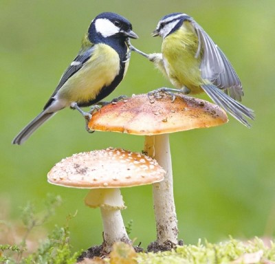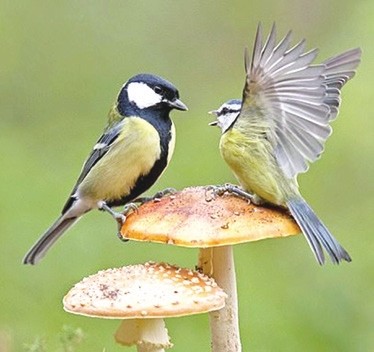两只山雀站在蘑菇上为争夺食物开战
