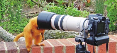 53岁摄影师Miles Herbert在Zoo动物园游玩时偶遇了一只金狮狨,这个可爱的小家伙看到Miles相机后立马好奇宝宝上线,围着相机好奇打探,它一会跳到长焦镜头上看看取景器,一会趴在取景器后一副摄影大师的模样,一会又把脑袋钻进镜头遮光罩,好奇不已的样子十分逗趣可爱。