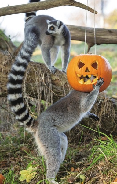 南瓜是狐猴们最爱的食物,从画面中可以看到,小家伙们发现饲养员精心雕琢的南瓜后兴奋不已,有一只环尾狐猴还将脑袋钻进去当帽子戴,与小伙伴们玩得不亦乐乎。