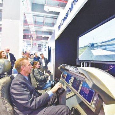 在美国波音公司展区,参观者在体验客机模拟起降设备。