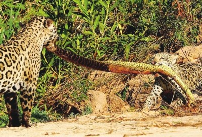 美洲豹与幼崽拿蟒蛇当绳子玩起拔河游戏