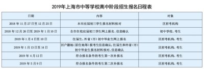 近日,《关于做好2019年上海市中等学校高中阶段招生报名工作的通知》对外发布。 一、报名对象及报名条件 (一)具有本市常住户籍的应届初三学生或18周岁以下(2001年9月1日及以后出生,下同)往届初中毕业生、结业生,可在学籍学校(或原初中毕业学校,下同)或户籍所在区报名。 (二)符合下列情况之一的非本市户籍学生可在本市参加中招报名: 1.考生父母一方持有效期内《上海市居住证》且积分达到标准分值,同时考生本人为持有效期内《上海市居住证》(或居住登记凭证)的应届初三学生或18周岁以下本市往届初中毕业生,可在学籍学校或考生所持有的《上海市居住证》(或居住登记凭证)上登记地址所在区报名。 2.考生父母一方及本人持有效期内《上海市海外人才居住证》或考生属于市人力资源和社会保障局认定的“本市户籍留学人员其持外国护照子女”,考生为本市应届初三学生或18周岁以下本市往届初中毕业生,可在学籍学校所在区报名。 3.考生父母一方为本市户籍,且考生为持有效期内《上海市居住证》连续满3年的本市应届初三学生或18周岁以下本市往届初中毕业生(往届生须取得2018年本市中招报名资格),可在学籍学校所在区报名。 4.考生父母一方为在沪高校、科研机构博士后流动站(工作站)人员,考生为应届初三学生或18周岁以下本市往届初中毕业生,可在学籍学校或设站单位所在区报名。 5.考生父母一方为经市政府合作交流办审核登记的地级市以上(含地级市)政府驻沪办事机构有关工作人员,考生为本市应届初三学生或18周岁以下本市往届初中毕业生,可在学籍学校所在区报名。 6.考生属在沪台胞,香港、澳门特别行政区永久居民身份,且为本市应届初三学生或18周岁以下本市往届初中毕业生,可在学籍学校所在区报名。 7.考生属经市政府侨办认定华侨身份,且为本市应届初三学生或18周岁以下本市往届初中毕业生,可在学籍学校所在区报名。 8.考生为在沪定居并持《中华人民共和国外国人永久居留证》,且为本市应届初三学生或18周岁以下本市往届初中毕业生,可在学籍学校所在区报考。 (三)考生属过渡期内锁定名单的大屯、梅山、鲁矿后方基地(以下简称“后方基地”)职工子女,且为应届初三学生或18周岁以下的往届初中毕业生,可在相应的后方基地报考。 (四)考生持有效签证的外国护照并合法在本市居留的,如继续在本市高中阶段学校升学就读,可在学籍学校所在区报考。 持外国护照的考生须参加本市初中毕业统一学业考试,参照考试成绩,由报名所在区教育局根据相关政策统筹安排入学。 (五)非本市户籍部分应届初中毕业生可参加本市部分全日制普通中等职业学校自主招收进城务工人员随迁子女的招生考试,具体办法另行通知。 (六)符合第(一)(二)款的本市应届初三残疾学生可参加本市高中阶段特殊教育学校(含普通中等职业学校附设特教班,下同)招生,在学籍学校所在区报名。 1.本市特殊教育学校应届初三残疾学生参加本市特殊教育初中毕业统一学业考试,报考本市高中阶段特殊教育学校。 2.本市初中学校随班就读的应届初三残疾学生,如确需参加本市特殊教育初中毕业统一学业考试、报考本市高中阶段特殊教育学校招生的,须于2019年1月21日之前向学校提出申请,并通过上海市特殊学生教育评估中心(以下简称“市特殊学生评估中心”)组织的评估。 二、报名时间及方式 2019年上海市中等学校高中阶段招生报名工作由市教育考试院具体负责。本市应届初三学生基本信息由本市“基础教育学生学籍信息系统”直接对接报名库。 (一)核对报名材料 本市应届初三学生报名材料核对时间为2018年11月27日—12月25日。核对信息后,学生信息如需修改的,关健信息须在“基础教育学生学籍信息系统”中进行修改后对接到中考报名库,其余信息可在中考报名库中进行修改。其他符合条件的考生报名材料在网上报名成功后进行核对。 (二)网上报名和信息确认 1.集体报名 符合本通知报名条件的本市应届初三学生由其学籍学校统一组织网上报名,时间为2018年12月26日—2019年1月10日。其中在学籍所在区参加报名的本市应届初三学生的信息确认与网上报名同时进行,回户籍所在地(居住地等)参加报名的本市应届初三学生的信息确认时间为2019年1月13日—14日。 通过评估的随班就读应届初三残疾学生网上报名并现场确认的时间与补报名时间同步。 2.个别报名 符合本通知报名条件的本市往届初中毕业生、结业生或外省(市)初中毕业生网上报名时间为2019年1月4日—10日,材料核对、信息确认时间为2019年1月13日—14日。 (三)补报名 符合本通知第一部分第(一)(二)(四)款规定的报名对象,如在统一报名时未能取得有效的证明材料,最迟应于2019年5月9日前持有效证明材料向区招考机构提出申请,经区招考机构核对并报市教育考试院中招办后予以补报名。参加补报名的考生从获得报名资格起按本市中招相关政策执行。