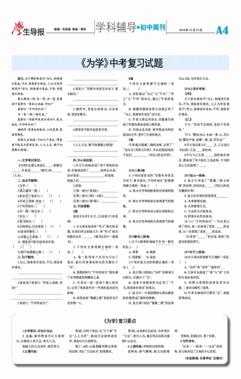 原文:天下事有难易乎?为之,则难者亦易矣;不为,则易者亦难矣。人之为学有难易乎?学之,则难者亦易矣;不学,则易者亦难矣。 蜀之鄙有二僧,其一贫,其一富。贫者语于富者曰:“吾欲之南海,何如?” 富者曰:“子何恃而往?”曰:“吾一瓶一钵足矣。” 富者曰:“吾数年来欲买舟而下,犹未能也。子何恃而往!” 越明年,贫者自南海还,以告富者。富者有惭色。 西蜀之去南海,不知几千里也,僧富者不能至而贫者至焉。人之立志,顾不如蜀鄙之僧哉? 一、文学常识填空: 《为学》这篇文章选自__________,原题为__________。作者是__________(朝代)的__________(人名)。 二、加点字解释: 1.为学:() 2.蜀之鄙有二僧:() 3.贫者语于富者曰:()() 4.吾欲之南海,何如:( )() 5.子何恃而往:() 6.吾一瓶一钵足矣:() 7.买舟:() 8.犹未能也:() 9.自南海还,以告富者:( )( ) 10.富者有惭色:() 11.西蜀之去南海:()() 12.僧富者不能至而贫者至焉:( )() 13.顾不如蜀鄙之僧:()() 三、句子翻译 1.为之,则难者亦易矣;不为,则易者亦难矣。 _______________________________________________________ 2.贫者语于富者曰:“吾欲之南海,何如?” _______________________________________________________ 3.富者曰:“子何恃而往?” _______________________________________________________ 4.富者曰:“吾数年来欲买舟而下,犹未能也。” _______________________________________________________ 5.越明年,贫者自南海还,以告富者。富者有惭色。 _______________________________________________________ 6.僧富者不能至而贫者至焉。 _______________________________________________________ 7.人之立志,顾不如蜀鄙之僧哉? _______________________________________________________ 四、中心和段意: 1.本文生动地讲述了两个和尚的故事,形象地说明了__________的辩证关系,告诉读者____________________的道理,勉励人们____________________。 2.段意: ①第一部分(第1段):__________________________________________________ ②第二部分(第2—6段):__________________________________________________ ③第三部分(第7段):__________________________________________________ 五、内容理解: A套 阅读《为学》全文,完成练习(语段略) 1.本文谈论的是和“学习”相关的话题,在我们学过的课文中,和“学习”相关的篇目还有__________(请写出其中一篇篇名)。 2.下列对文意理解正确的一项是:( ) A.第一段用两个反问句引出了观点:做任何事难易转化的关键在于“为”。 B.富僧的两句“子何恃而往”都充满了对穷僧强烈的嘲讽之意。 C.作者以一富一贫两个僧人的对比,证明了客观条件对一件事的成功没有影响。 D.结尾处的“蜀鄙之僧”指的其实只是穷僧一人。 B套 下列对文意理解不正确的一项是:( ) A.首段通过“为之”与“不为”,“学之”与“不学”的对比,提出了作者的观点。 B.蜀鄙穷僧的故事生动地证明了“为之,则难者亦易矣”这句话。 C.作者主要运用语言、肖像描写刻画了穷僧知难而进的人物形象。 D.末段由此及彼,将穷僧成功的经验加以引申,重申了文章的观点。 C套 作者通过蜀鄙二僧的故事,证明了“__________”这句话(用原文回答),并以此勉励他的子侄们__________(用自己的话回答)。 2012二模A卷: 3.下列对富者说的“吾数年来欲买舟而下,犹未能也。子何恃而往”的情感理解正确的一项是:() A.表示对穷和尚能够前往南海的愤怒。 B.表示对穷和尚前往南海勇气的敬佩。 C.表示对穷和尚决心前往南海的讥讽。 D.表示对穷和尚前往南海勇气的感慨。 2013静安二模卷: 1.以下人物和彭端淑不在同一朝代的是:( ) A.郑燮 B.姚鼐 C.周敦颐 D.袁枚 3.下列对选文内容理解正确的一项是:( ) A.选文第⑴段指出“为学”的难易可以转化,关键在于“为”。 B.故事中贫僧的所为证明了“不为,则易者亦难矣”的观点。 C.选文⑶—⑹段富僧的心理由最初的轻蔑变成了最终的敬佩。 D. 选文第⑺段由“蜀鄙二僧”的故事引出主旨:为学贵在立志。 2014上海中考卷: 【甲】 天下事有难易乎?为之,则难者亦易矣;不为,则易者亦难矣。人之为学有难易乎?学之,则难者亦易矣;不学,则易者亦难矣。 【乙】 子曰:“学而不思则罔,思而不学则殆。” 子曰:“譬如为山,未成一篑,止,吾止也!譬如平地,虽覆一篑,进,吾往也!” 8.甲文选自课文《》;乙文选自《论语》,它是__________家经典。 9.甲文与乙文第__________段的意思相近,都谈到了学习贵在主动进取,不同的是乙文还谈到了__________。 2017宝山一模卷: 8.选文中讲述了“蜀鄙二僧去南海”的故事,其结局是__________(用自己的语句概括回答) 9. 选文告诉我们的道理是__________ A.凡事都要实践。 B.凡事都要立志。 C.立志而为才能成功。 D.财富未必带来成功。 10.(1)“子何恃而往”一句反复出现了两次。前一次表现了富者__________的态度,后一次表现了富者__________的态度。 (2)贫者“__________”的话语,表现了他面对困难的勇气。 2017长宁二模卷: 10.对文章内容理解不正确的一项是:( ) A.“为学”即“求学”“做学问”。 B.文章开头阐述了“难”与“易”之间的关系是相对的。 C.贫僧与富僧的故事是事实论据,二者对比阐明了道理。 D.作者告诫我们只要有“志”,就能获得成功。 《为学》复习要点 1.文学常识:清朝彭端淑。 2.主旨:阐明难易可以互相转化,关键是人贵立志,事在人为。 勉励人们立志求学,刻苦努力。 3.主要内容: 第1段:以两个设问,从“天下事”引出“人之为学”,阐述无论做事或求学,难易可以