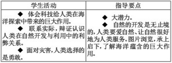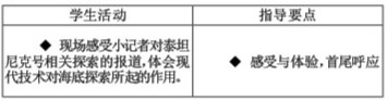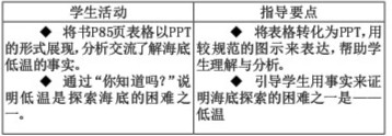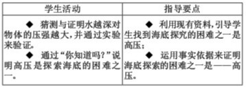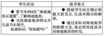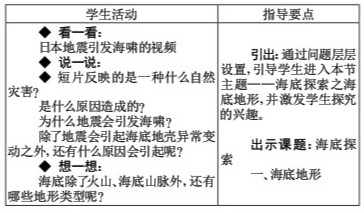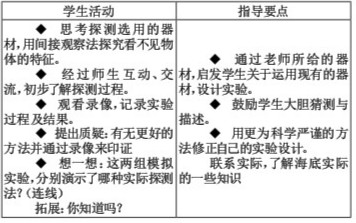 一、教材与学情分析 《海底探索》选自牛津上海版《科学》七年级第二学期第14章“海洋与海洋开发”第二节第一课时。本课时的教学任务是通过探究看不见物体的特征,应用间接观察方法,体会探索海底世界必须克服的一些困难,知道海底复杂的地形地貌。通过读图,找出海水温度随海洋深度增加而变化的规律,体会科技进步对探索海洋的作用,激发开发海洋的兴趣。通过阅读分析资料、实验探究,知道海水随着深度增加,温度和压强变化的规律,形成探索科学的兴趣。 根据七(11)班学生的特点:充满好奇,有积极的探究和表现欲望,具备一定的自然科学知识,能运用所学的探究方法(观察、记录、猜测等)进行探究与分析,且作为实验班的学生乐于分享和互动,可布置一些具有挑战性的活动,激发更多的学生积极投入! 基于以上,本课时在学生充分预习的基础上,期待通过教师重新组合本课知识体系,设置适合实验班孩子的活动,主动获得知识,能分享所得,并积极运用到实践中。 二、教学目标 1.通过探究看不见物体的特征,应用间接观察方法,体会探索海底世界必须克服的一些困难,知道海底复杂的地形地貌。 2.通过读图,找出海水温度随海洋深度增加而变化的规律,体会科技进步对探索海洋的作用,激发开发海洋的兴趣。 3.通过阅读分析资料、实验探究,知道海水随着深度增加,温度和压强变化的规律,形成探索科学的兴趣。 三、学习重点和难点 【重点】了解探索海底世界必须克服的困难 【难点】知道随着深度增加,海水温度和压强变化的规律 四、教学准备 【器材】手模模型(模拟海底地形测量) 烧杯 玻璃棒 小桶 模拟测试水压强弱的实验装置 【资源】教师PPT 阅读资料 学生探究活动单 五、教学活动设计 引入:创设情境,激发学生探究兴趣,导入课题 活动目标:1.通过观看日本地震引发海啸的视频,激发学生丰富的想象力与学习兴趣; 2.引入课题——海底探索。 活动一:依据海底地形示意图,完成自学与填空 活动目标: 1.通过阅读书本中的“海底地形示意图”,了解海底地形特征,并完成书本空格的填写。 2.通过拓展知识“你知道吗?”,体会到科技进步对探索海洋的作用。 活动二:模拟海底地形探测 活动目标: 1.通过老师提供的实验器材,应用间接观察的方法模拟海底探测,体会真实海底探索过程中的艰难。 2.通过录像印证,了解海底探索的方法,并提出这样的方法是否满意,进而提出改进建议。 活动三:探索海底世界的困难——高压 活动目标: 1.通过阅读资料,知道海底探索面临的困难之一是高压。 2.通过实验演示,知道水越深所受的压强越大。 3.进一步通过事实依据(你知道吗?)说明高压是海底探索的困难之一。 活动四:探索海底世界的困难——低温 活动目标: 1.通过书P85页提供的表格资料,了解海底的低温事实。 2.进一步通过事实依据(你知道吗?)说明低温是海底探索的困难之一。 承上启下:回顾与总结 活动目标: 通过思维导图的制作,对所学知识进行归纳与总结,也是对所学知识的一个检测。 活动五:走进直播间 通过小记者的现场直播,再次激发学生对海底的探究兴趣,与开始进行呼应。 总结与提升 活动目标: 1.通过图片进一步引导学生体会科技给人类在海洋探索中带来的巨大作用。 2.联系日本3·11地震带来的次生灾害——海啸,辩证地认识人类在自然开发与利用中的利弊关系。 3.面对灾害,勇敢选择继续探索,做探索路上真正的智慧勇士。 六、课后反思 1.将表格转化为PPT,通过请教地理学科的老师用规范的图示来表达,帮助学生理解与分析,课堂效果很好,表现在完成学习单上,易读懂并很快找到规律,且与实践联系紧密。 2.思维导图的运用,可以有效地引导学生将本节知识进行梳理并内化。 3.小记者的报道,让课堂氛围活跃有趣,参与度大,学以致用。 4.课堂教具的挖掘与使用,也是本节课的一个特点,例如在海底地形模拟时,用了学生平时玩的手模模具,体会海底摸索的方法,再结合分组探究,化解难点。 5.面对实验班孩子强烈的求知欲,可以将课堂更多地交给学生,更多体现学生的主动性与教师的引导作用,这是未来需要更多下功夫的方向!