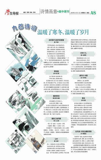凉州馆中与诸判官夜集 唐·岑参 弯弯月出挂城头,城头月出照凉州。 凉州七里十万家,胡人半解弹琵琶。 琵琶一曲肠堪断,风萧萧兮夜漫漫。 河西幕中多故人,故人别来三五春。 花门楼前见秋草,岂能贫贱相看老。 一生大笑能几回,斗酒相逢须醉倒。 “一生大笑能几回,斗酒相逢须醉倒。”一个“笑”字,写出岑参和他朋友的本色。宴会中不时地爆发出大笑声,这样的欢聚,这样的大笑,一生中也难得有几回,老朋友们端着酒杯相遇在一起,能不为之醉倒? 答陆澧 唐·张九龄 松叶堪为酒,春来酿几多。 不辞山路远,踏雪也相过。 这首绝句体小诗,短小而质朴,亲切而自然。诗中用语极为平实,几乎就是口头语,然而从容写来,淡而有味,语浅情深,言有尽而意无穷。这里有陶渊明田园诗的影子,这种风格又被后来的王维、孟浩然等发扬光大,形成山水田园一派,张九龄不愧为开启盛唐诗风的诗坛领袖。 赠范晔诗 南北朝·陆凯 折花逢驿使,寄与陇头人。 江南无所有,聊赠一枝春。 这首诗当是陆凯率兵南征登梅岭时所作。他在戎马倥偬中登上梅岭,正值岭梅怒放,立马于梅花丛中,回首北望,想起了陇头好友范晔,又正好碰上北去的驿使,就出现了折梅赋诗赠友人的一幕,于是写下这首诗。 题秋江独钓图 清·王士祯 一蓑一笠一扁舟,一丈丝纶一寸钩。 一曲高歌一樽酒,一人独钓一江秋。 全诗描写了一个渔夫打扮的人,在江上垂钓的情形:一件蓑衣、一顶斗笠、一叶轻舟、一支钓竿,垂钓者一面歌唱,一面饮酒,垂钓的潇洒被刻画得活灵活现。 江村 唐·杜甫 清江一曲抱村流,长夏江村事事幽。 自去自来堂上燕,相亲相近水中鸥。 老妻画纸为棋局,稚子敲针作钓钩。 但有故人供禄米,微躯此外更何求? 这是一首平淡自然的七言律诗,作者以清淳质朴的笔调、质朴无华的语言,点染出浣花溪畔幽美宁静的自然风光和村居生活清悠闲适的情趣,将夏日江村最寻常而又最富于特色的景象,描绘得真切生动,自然可爱,颇具田园诗萧散恬淡、幽雅浑朴的风韵。 问刘十九 唐·白居易 绿蚁新醅酒,红泥小火炉。 晚来天欲雪,能饮一杯无? 刘十九是作者在江州时的朋友,作者另有《刘十九同宿》诗,说他是嵩阳处士。全诗寥寥二十字,没有深远寄托,没有华丽辞藻,字里行间却洋溢着热烈欢快的色调和温馨炽热的情谊,表现了温暖如春的诗情。 清平乐·村居 宋·辛弃疾 茅檐低小,溪上青青草。 醉里吴音相媚好,白发谁家翁媪? 大儿锄豆溪东,中儿正织鸡笼。 最喜小儿亡赖,溪头卧剥莲蓬。 诗人描绘了一家五口在乡村的生活情态,表现了生活之美和人情之美,体现了作者对田园安宁、平静生活的羡慕与向往。 客至 唐·杜甫 舍南舍北皆春水,但见群鸥日日来。 花径不曾缘客扫,蓬门今始为君开。 盘飧市远无兼味,樽酒家贫只旧醅。 肯与邻翁相对饮,隔篱呼取尽馀杯。 久经离乱的杜甫,安居成都草堂后不久,在客人来访时作了这首诗。前两句描写居处的景色,清丽疏淡,与山水鸥鸟为伍,显出与世相隔的心境;后面写有客来访的欣喜以及淳恳待客,呼唤邻翁对饮的场景,表现出宾主之间无拘无束的情谊,诗人为人的诚朴厚道跃然纸上。诗中流露出一种闲适恬淡的情怀,诗语亲切,如话家常。 定风波·次高左藏使君韵 宋·黄庭坚 万里黔中一漏天,屋居终日似乘船。 及至重阳天也霁,催醉,鬼门关外蜀江前。 莫笑老翁犹气岸,君看,几人黄菊上华颠? 戏马台南追两谢,驰射,风流犹拍古人肩。 这是黄庭坚贬谪黔州期间的作品。该词主要通过重阳即事,写出了黄庭坚在穷困险恶的处境中,不向命运屈服的博大胸怀,抒发了一种老当益壮、穷且益坚的乐观奋发精神。