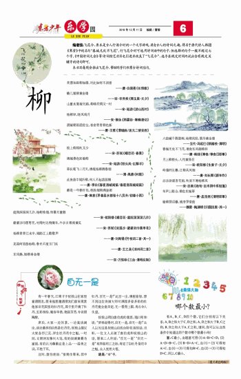编者按:飞花令,原本是古人行酒令时的一个文字游戏,源自古人的诗词之趣,得名于唐代诗人韩翃《寒食》中的名句“春城无处不飞花”。行飞花令时可选用诗词曲中的句子,但选择的句子一般不超过七个字。《中国诗词大会》等诗词综艺栏目也引进并改良了“飞花令”,选手在规定时间内说出含有规定关键字的诗句即可。 本栏目每周会推出飞花令,帮助同学们积累古诗词佳句。 芙蓉如面柳如眉,对此如何不泪垂 ——唐·白居易《长恨歌》 蛾儿雪柳黄金缕 ——宋·辛弃疾《青玉案·元夕》 山重水复疑无路,柳暗花明又一村 ——宋·陆游《游山西村》 杨柳岸,晓风残月 ——宋·柳永《雨霖铃·寒蝉凄切》 渭城朝雨浥轻尘,客舍青青柳色新 ——唐·王维《渭城曲/送元二使安西》 枝上柳绵吹又少 ——宋·苏轼《蝶恋花·春景》 满城春色宫墙柳 ——宋·陆游《钗头凤·红酥手》 草长莺飞二月天,拂堤杨柳醉春烟 ——清·高鼎《村居》 此夜曲中闻折柳,何人不起故园情 ——唐·李白《春夜洛城闻笛/春夜洛阳城闻笛》 最是一年春好处,绝胜烟柳满皇都 ——唐·韩愈《早春呈水部张十八员外/初春小雨》 庭院深深深几许,杨柳堆烟,帘幕无重数 ——宋·欧阳修《蝶恋花·庭院深深深几许》 簌簌衣巾落枣花,村南村北响缫车,牛衣古柳卖黄瓜 ——宋·苏轼《浣溪沙·簌簌衣巾落枣花》 杨柳青青江水平,闻郎江上踏歌声 ——唐·刘禹锡《竹枝词二首·其一》 羌笛何须怨杨柳,春光不度玉门关 ——唐·王之涣《凉州词二首》 东风静、细柳垂金缕 ——宋·万俟咏《三台·清明应制》 六曲阑干偎碧树,杨柳风轻,展尽黄金缕 ——五代·冯延巳《鹊踏枝·清明》 春城无处不飞花,寒食东风御柳斜 ——唐·韩翃《寒食/寒食日即事》 月上柳梢头,人约黄昏后 ——宋·欧阳修《生查子·元夕》 岭猿同旦暮,江柳共风烟 ——唐·刘长卿《新年作》 沾衣欲湿杏花雨,吹面不寒杨柳风 ——宋·志南《绝句·古木阴中系短篷》 车声上路合,柳色东城翠 ——唐·孟浩然《清明即事》 榆柳荫后檐,桃李罗堂前 ——魏晋·陶渊明《归园田居·其一》