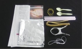 材料:2把塑料汤匙、1张报纸、4根橡皮筋、2根长30厘米的细纱绳、1张铝箔纸、2根绒条、1把夹子、4根吸管。另有5个乒乓球和5个高尔夫球,球和夹子均不能损坏。