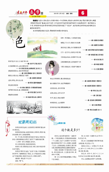 编者按:飞花令,原本是古人行酒令时的一个文字游戏,源自古人的诗词之趣,得名于唐代诗人韩翃《寒食》中的名句“春城无处不飞花”。行飞花令时可选用诗词曲中的句子,但选择的句子一般不超过七个字。《中国诗词大会》等诗词综艺栏目也引进并改良了“飞花令”,选手在规定时间内说出含有规定关键字的诗句即可。 本栏目每周会推出飞花令,帮助同学们积累古诗词佳句。 更深月色半人家,北斗阑干南斗斜 ——唐·刘方平《月夜/夜月》 水光潋滟晴方好,山色空蒙雨亦奇 ——宋·苏轼《饮湖上初晴后雨二首·其二》 渭城朝雨浥轻尘,客舍青青柳色新 ——唐·王维《渭城曲/送元二使安西》 满面尘灰烟火色,两鬓苍苍十指黑 ——唐·白居易《卖炭翁》 过桥分野色,移石动云根 ——唐·贾岛《题李凝幽居》 草色烟光残照里 ——宋·柳永《蝶恋花·伫倚危楼风细细》 角声满天秋色里,塞上燕脂凝夜紫 ——唐·李贺《雁门太守行》 满城春色宫墙柳 ——宋·陆游《钗头凤·红酥手》 回眸一笑百媚生,六宫粉黛无颜色 ——唐·白居易《长恨歌》 峨嵋山下少人行,旌旗无光日色薄 ——唐·白居易《长恨歌》 俄顷风定云墨色,秋天漠漠向昏黑 ——唐·杜甫《茅屋为秋风所破歌》 江天一色无纤尘,皎皎空中孤月轮 ——唐·张若虚《春江花月夜》 天阶夜色凉如水,卧看牵牛织女星 ——唐·杜牧《秋夕》 白雪却嫌春色晚,故穿庭树作飞花 ——唐·韩愈《春雪》 不要人夸颜色好,只留清气满乾坤 ——元·王冕《墨梅》 弟走从军阿姨死,暮去朝来颜色故 ——唐·白居易《琵琶行/琵琶引》 钿头银篦击节碎,血色罗裙翻酒污 ——唐·白居易《琵琶行/琵琶引》 戍客望边色,思归多苦颜 ——唐·李白《关山月》 远看山有色,近听水无声 ——唐·王维《画》 车声上路合,柳色东城翠 ——唐·孟浩然《清明即事》 树树皆秋色,山山唯落晖 ——唐·王绩《野望》 络纬秋啼金井阑,微霜凄凄簟色寒 ——唐·李白《长相思·其一》