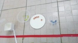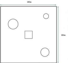要求:有一个1.2m×1.2m的胶带框,任何人身体的任何部分都不能进入胶带区域。在胶带区域中央有一个盒子,在盒子周围有3个容器,每个可以放5个弹珠。这里有3种不同颜色的弹珠,另有一张放着材料的桌子。