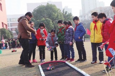 12月17日,杨浦小学的升旗仪式有了与平日不一般的元素——全校师生在跑道上围成一圈,绿茵场上,各类车模、飞机模型整装待发。原来,这次升旗仪式也是杨浦小学科技节的开幕仪式。同学们将在这次科技节上参加“炫动车壳绘画”、“越野车体验”、“竞速车模讲座”等活动,从多方面感受车文化。 升旗仪式完毕,只听得一声令下,草坪上等待多时的航模小组的同学们手上的彩色“飞机”冲上云霄,在蓝天白云下自由翱翔,煞是漂亮!围观的同学发出阵阵欢呼。等“飞机”徐徐降落,前来科技节助兴的杨浦区少科站的周站长又带着他的车模队开始了表演,一辆辆车模在绿茵场上纵横驰骋,左冲右突灵活绕过障碍物,不过当两辆车模在爬一个大斜坡时却不小心冲出跑道摔了个人仰马翻,笨拙的样子,逗得同学们哈哈大笑。压轴表演当然是我们帅气的无人机,无人机在各年级队列头上巡视一圈,所到之处,如明星到场,同学们纷纷仰着小脸、伸出双手和头顶的无人机说“Hello”。 据杨浦小学的科技老师温老师介绍,学校这次分年级围绕车子开展了各类科技节活动,一年级的主题是“气动力小车”,二年级的主题是“3D拼装立体回力车”,三年级的主题是“拉线回力车”,四年级的主题是“风力小车”,五年级的主题则是“竞速遥控车”。 据记者了解这场“车”主题的科技节背后,是杨浦小学一直以来对校园车模社团的支持,该校表示将力争把校园车模社团打造成学校特色项目,甚至是市级的特色校园车模特色科技社团。