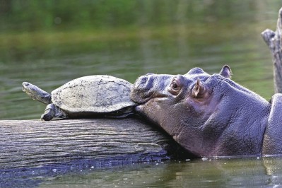 日前,摄影师拍到了一只皮上天的河马小宝宝,这个顽皮的小家伙看到一只林龟在木桩上休息,便悄悄地跑到人家身后,趁着它不注意,在它的屁股上咬了一口,画面十分逗趣。