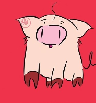 点评:作者于额头和尾巴上的两笔线条抓住了小猪的重要形象特征,使得画面整体更加贴合小猪样貌,呆萌的表情十分可爱,印章样式的“福”字更是带着满满的年味儿。
