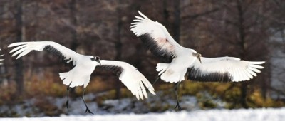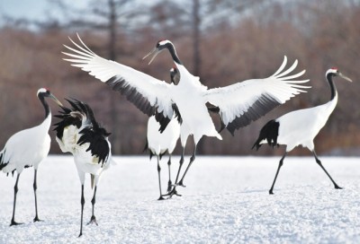 当地时间2018年12月18日,日本北海道鹤居伊藤丹顶鹤保护所(Tsurui-Ito tancho Sanctuary)里,丹顶鹤(日本鹤)在雪地里嬉闹起舞。