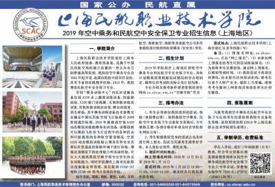 2019年空中乘务和民航空中安全保卫专业招生信息(上海地区) 一、学院简介 上海民航职业技术学院是经上海市人民政府批准、教育部备案、直属于中国民用航空局的独立设置的一所公办全日制普通高等院校。我院的空中乘务专业自1982年起开设,是国内院校中较早开设的,具有丰富的实践教学经验。2010年,我院增设民航空中安全保卫专业。 学院“乘务训练中心”内实训设施设备包括A330水上撤离训练设备、恒温游泳池、A320舱门训练器、无氧体能训练实训室、有氧体能训练实训室、搏击训练室、羽毛球场,其中乘务训练设备技术参数完全满足中国民用航空局飞行标准司2009咨询通告标准。2016年新建成空客A320动态模拟训练舱乘务实训设备,该模拟舱可以模拟飞机在飞行过程中的各种状态和可能遇到的各种航空紧急情况,空客A320动态模拟训练舱让乘务员和安全员得以在更逼真的客舱环境下进行训练,增强应急情况下的处理能力和实战经验,可以大大提高我院空乘空保专业学生的安全训练能力。同时学院拥有上海市民航职业技能鉴定所资质,是民航局CCAR-147部和CCAR-66部考点资质的学院。 每年东航、国航、南航、厦航、山航、吉祥航空、春秋航空、海航等多家航空公司多次来我院进行校招和社招乘务(安全员)学员。 二、招生计划 2019年学院拟在上海地区招收空中乘务专业和民航空中安全保卫专业,具体计划数我院将根据面试情况科学合理制定,最终以市考试院实际公布计划为准。 专业介绍及报考条件请查看我院招生网站zs.shcac.edu.cn“空乘空保”栏目 三、报考办法 1、考生必须参加我院组织的面试、体检(体检费自理),取得我院空中乘务、民航空中安全保卫专业备取生资格后,方可填报志愿(各类合格名单将及时在学院招生网站公布)。 2、考生根据我院发布的面试公告及时进行网上报名,面试当天请考生需带好手机、本人身份证原件、黑色水笔。 3、面试时间和地点: 网上预报名时间:2018年12月20日至2019年1月18日 面试时间:2019年1月20日(9:00—11:00;13:00-14:30),请及时关注我院招生信息网; 面试地点:上海民航职业技术学院(上海市徐汇区龙华西路1号) 备注:(1)预报名网址:zs.shcac.edu.cn,点击“网上报名”;(2)未参加网上预报名的考生可到面试现场报名;(3)为获得考生完整信息,建议网上预报名,以缩短等候时间。(4)我院面试不收取任何费用,也未委托任何培训机构,请考生注意个人财产安全,谨防上当受骗。请报考考生随时上网查询具体信息和关注招生微信。 四、录取原则 凡报考我校空中乘务及民航空中安全保卫专业的考生均要取得我校专业备取生资格,录取原则依照《2019年上海民航职业技术学院招生章程》。 五、学制学历、收费标准 学生入学后,进行三年制高职(大专)教育,符合毕业资格后颁发国家教育部承认的空中乘务或民航空中安全保卫专业大专毕业证。学费每生每学年7500元(沪价行(2000)120号)。 联系部门:上海民航职业技术学院招生办公室 邮编:200232 咨询电话:021-34693230 021-64572049 招生网址:zs.shcac.edu.cn
