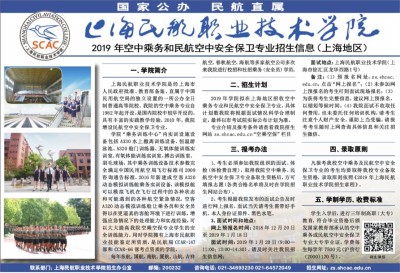 2019年空中乘务和民航空中安全保卫专业招生信息(上海地区) 一、学院简介 上海民航职业技术学院是经上海市人民政府批准、教育部备案、直属于中国民用航空局的独立设置的一所公办全日制普通高等院校。我院的空中乘务专业自1982年起开设,是国内院校中较早开设的,具有丰富的实践教学经验。2010年,我院增设民航空中安全保卫专业。 学院“乘务训练中心”内实训设施设备包括A330水上撤离训练设备、恒温游泳池、A320舱门训练器、无氧体能训练实训室、有氧体能训练实训室、搏击训练室、羽毛球场,其中乘务训练设备技术参数完全满足中国民用航空局飞行标准司2009咨询通告标准。2016年新建成空客A320动态模拟训练舱乘务实训设备,该模拟舱可以模拟飞机在飞行过程中的各种状态和可能遇到的各种航空紧急情况,空客A320动态模拟训练舱让乘务员和安全员得以在更逼真的客舱环境下进行训练,增强应急情况下的处理能力和实战经验,可以大大提高我院空乘空保专业学生的安全训练能力。同时学院拥有上海市民航职业技能鉴定所资质,是民航局CCAR-147部和CCAR-66部考点资质的学院。 每年东航、国航、南航、厦航、山航、吉祥航空、春秋航空、海航等多家航空公司多次来我院进行校招和社招乘务(安全员)学员。 二、招生计划 2019年学院拟在上海地区招收空中乘务专业和民航空中安全保卫专业,具体计划数我院将根据面试情况科学合理制定,最终以市考试院实际公布计划为准。 专业介绍及报考条件请查看我院招生网站zs.shcac.edu.cn“空乘空保”栏目 三、报考办法 1、考生必须参加我院组织的面试、体检(体检费自理),取得我院空中乘务、民航空中安全保卫专业备取生资格后,方可填报志愿(各类合格名单将及时在学院招生网站公布)。 2、考生根据我院发布的面试公告及时进行网上报名,面试当天请考生需带好手机、本人身份证原件、黑色水笔。 3、面试时间和地点: 网上预报名时间:2018年12月20日至2019年1月18日 面试时间:2019年1月20日(9:00—11:00;13:00-14:30),请及时关注我院招生信息网; 面试地点:上海民航职业技术学院(上海市徐汇区龙华西路1号) 备注:(1)预报名网址:zs.shcac.edu.cn,点击“网上报名”;(2)未参加网上预报名的考生可到面试现场报名;(3)为获得考生完整信息,建议网上预报名,以缩短等候时间。(4)我院面试不收取任何费用,也未委托任何培训机构,请考生注意个人财产安全,谨防上当受骗。请报考考生随时上网查询具体信息和关注招生微信。 四、录取原则 凡报考我校空中乘务及民航空中安全保卫专业的考生均要取得我校专业备取生资格,录取原则依照《2019年上海民航职业技术学院招生章程》。 五、学制学历、收费标准 学生入学后,进行三年制高职(大专)教育,符合毕业资格后颁发国家教育部承认的空中乘务或民航空中安全保卫专业大专毕业证。学费每生每学年7500元(沪价行(2000)120号)。 联系部门:上海民航职业技术学院招生办公室 邮编:200232 咨询电话:021-34693230 021-64572049 招生网址:zs.shcac.edu.cn