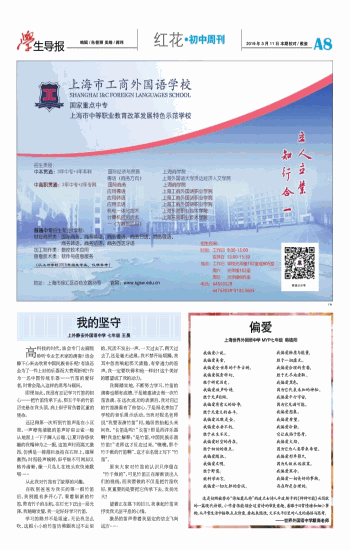 上海世界外国语中学 MYP七年级 韩镇阳 我偏爱小说。 我偏爱美食, 我偏爱全世界的千年古树。 我偏爱探索科幻, 胜于研究历史。 我偏爱放声吟诗, 胜于无声自陶。 我偏爱有意义的纷争, 胜于无意义的奋斗。 我偏爱沉默是金。 我偏爱永垂不朽, 胜于永生不灭。 我偏爱时空的存在, 胜于初始的原点。 我偏爱随机。 我偏爱文明, 胜于野蛮。 就科学而言, 我偏爱一切大胆的尝试。 我偏爱物质与能量, 胜于一切虚无。 我偏爱合理的贪婪, 胜于无尽地索取。 我偏爱黑色, 因为它代表未知的神秘。 我偏爱平行宇宙, 因为它充满可能。 我偏爱想象。 我偏爱希望。 我偏爱冷静, 它让我陷于思考。 我偏爱火焰, 因为它为人类带来希望。 我偏爱形单影只, 因为无敌永远寂寞。 我偏爱寒冷。 我偏爱一切美好的事物, 存在即是合理的。 这是仿照被誉为“诗坛莫扎特”的波兰女诗人辛波斯卡的《种种可能》而写就的一篇现代诗歌。小作者很能领会这首诗的审美意趣,着眼于日常情绪和细小事物,从平常生活中拾取点点诗意,看起来随性,又不失平日里对人生的感悟与思考。 ——世界外国语中学戴裔老师