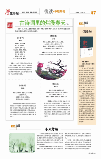 古今中外,多少文人墨客挥笔洒墨沉醉于婀娜多姿的春景之中。让我们一起学习有关春天的诗词,在无限好的春光里,品读词人的情怀。 《行香子》 秦观 树绕村庄,水满陂塘。 倚东风、豪兴徜徉。 小园几许,收尽春光。 有桃花红,李花白,菜花黄。 远远围墙,隐隐茅堂。 飏青旗、流水桥旁。 偶然乘兴、步过东冈。 正莺儿啼,燕儿舞,蝶儿忙。 【释义】全词写景状物,围绕词人游春足迹这个线索次第展开,不慌不忙而意趣自出。词人运用通俗、生动、朴素、清新的语言写景状物;使质朴自然的村野春光随词人轻松的脚步得到展现。全词意兴盎然,洋溢着一种由衷的快意和舒畅。 《采桑子》 欧阳修 群芳过后西湖好,狼籍残红,飞絮濛濛。 垂柳阑干尽日风。 笙歌散尽游人去,始觉春空。 垂下帘栊,双燕归来细雨中。 【释义】这是欧阳修晚年退居颍州时写的十首《采桑子》中的第四首,抒写了作者寄情湖山的情怀。虽写残春景色,却无伤春之感,而是以疏淡轻快的笔墨描绘了西湖的暮春风景,创造出一种清幽静谧的艺术境界。而词人的安闲自适,也就在这种境界中自然地表现出来。情景交融,真切动人。 《蝶恋花》 苏轼 花褪残红青杏小。燕子飞时,绿水人家绕。 枝上柳绵吹又少,天涯何处无芳草! 墙里秋千墙外道。墙外行人,墙里佳人笑。 笑渐不闻声渐悄,多情却被无情恼。 【释义】词人写了春天的景,春天的人,全词于清新中蕴涵哀怨,于婉丽中透出伤情,意境朦胧,韵味无穷。 《临江仙》 晏几道 梦后楼台高锁,酒醒帘幕低垂。 去年春恨却来时,落花人独立,微雨燕双飞。 记得小蘋初见,两重心字罗衣。 琵琶弦上说相思,当时明月在,曾照彩云归。 【释义】这首《临江仙》含蓄真挚,字字关情。词的上阕“去年春恨却来时”可说是词中的一枚时针,它表达了词人处于痛苦和迷惘之中,其原因是由于他和小苹有过一段甜蜜幸福的爱情。时间是这首词的主要线索。其余四句好像是四个相对独立的镜头(即1.梦后,2.酒醒,3.人独立,4.燕双飞),每个镜头都渲染着词人内心的痛苦,句句景中有情。