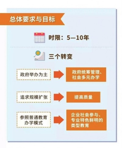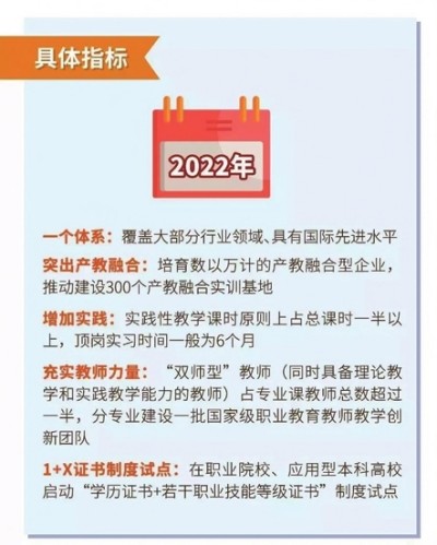 最近,“职教20条”成为职教人最常说起的“关键词”与“流行语”。日前,国务院发布《国家职业教育改革实施方案》(下称《方案》),把奋力办好新时代职业教育的决策部署细化为若干具体行动,提出了7个方面20项政策举措。教育部召开新闻发布会,专门对此《方案》的具体内容进行解读。 《方案》具体举措有哪些?新时代职业教育路线图长啥样?我们将分三期为大家解读《方案》的重点内容。先让我们通过一组数字来了解一下《方案》。 每年调整1次专业 每3年修订1次教材 当前社会新技术、新工艺等变化较大,要使学校变化密切跟踪市场需求,《方案》提出:原则上每5年修订1次职业院校专业目录,学校依据目录灵活自主设置专业,每年调整1次专业,每3年修订1次教材,其中专业教材随信息技术发展和产业升级情况及时动态更新。 建设50所高水平高等职业学校 据介绍,《方案》主要从职业院校、参与企业、专业教师等方面提出了具体指标要求。到2022年,职业院校教学条件基本达标,一大批普通本科高等学校向应用型转变,建设50所高水平高等职业学校和150个骨干专业(群)。建成覆盖大部分行业领域、具有国际先进水平的中国职业教育标准体系。 教师需有3年以上企业工作经历 有好老师才有可能带出好徒弟。要解决以往师资实践能力弱的现状,《方案》提出:从2019年起,职业院校、应用型本科高校相关专业教师原则上从具有3年以上企业工作经历并具有高职以上学历的人员中公开招聘,特殊高技能人才(含具有高级工以上职业资格人员)可适当放宽学历要求,2020年起基本不再从应届毕业生中招聘。 推进“学分银行” 启动“1+X”证书制度 此外,《方案》也提出,将加快推进职业教育国家“学分银行”建设,从2019年开始,探索建立职业教育个人学习账号,实现学习成果可追溯、可查询、可转换。 而职业教育学生的评价标准和方式未来也将发生改变,不再唯学历。据了解,从今年开始,部分试点学校将启动“1+X”证书制度试点工作。其中“1”是学历证书,也就是中职、高职或者本科,而“X”则是各类职业技能等级证书。证书分为初级、中级、高级,是职业技能水平的凭证。