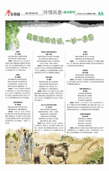 《清明》 宋·王禹偁 无花无酒过清明,兴味萧然似野僧。 昨日邻家乞新火,晓窗分与读书灯。 【赏析】 清明节时,诗人无花无酒,兴味索然,就是无聊没意思,就像荒山野庙的和尚一般。怎么破解这种寂寞,诗人于是用从邻家讨来新燃的火种,在清明节的一大早,就在窗前点灯,坐下来潜心读书。 《清明》 宋·黄庭坚 佳节清明桃李笑,野田荒冢自生愁。 雷惊天地龙蛇蛰,雨足郊原草木柔。 人乞祭余骄妾妇,士甘焚死不公侯。 贤愚千载知谁是,满眼蓬蒿共一丘。 【赏析】 北宋诗人黄庭坚在清明这天,颇有感悟。诗人将大自然中的勃勃生机与人世间不可逃脱的死亡命运进行对照,表现出了消极虚无的思想,抒发了诗人对人生无常的慨叹和对社会不平的愤激。 《苏堤清明即事》 宋·吴惟信 梨花风起正清明,游子寻春半出城。 日暮笙歌收拾去,万株杨柳属流莺。 【赏析】 江南三月,年轻人结伴出城,踏青寻春,笙笛呜咽,歌声袅袅,微风拂面,杨柳依依。这个清明节,如果无雨有风,就出去踏青吧。把对亲人的思念散在清洁明净的风里,它们会随种子一起落下,生根发芽。 《蝶恋花·遥夜亭皋闲信步》 南唐·李煜 遥夜亭皋闲信步,乍过清明,早觉伤春暮。 数点雨声风约住,朦胧淡月云来去。 桃李依依春暗度,谁在秋千,笑里低低语。 一片芳心千万绪,人间没个安排处。 【赏析】 清明节刚过,诗人就感慨春天的离去。词的上片写主人公信步闲情、伤春感怀的情形,下片写主人公感慨春去、无以自慰的悲愁情怀。这首词多用白描手法,质朴无华,淡雅疏朗,含蓄悠远。 《郊行即事》 宋·程颢 芳原绿野恣行事,春入遥山碧四围。 兴逐乱红穿柳巷,困临流水坐苔矶。 莫辞盏酒十分劝,只恐风花一片飞。 况是清明好天气,不妨游衍莫忘归。 【赏析】 清明来了,有人伤感,有人伤春,而程颢却感慨时光的流逝。作者描写了清明节春天原野上清新的景致,将追逐落花的小游戏写进了诗里,在平添几许稚趣的同时,劝说世人珍惜友情、珍惜时光。 《风入松·听风听雨过清明》 宋·吴文英 听风听雨过清明,愁草瘗花铭。 楼前绿暗分携路,一丝柳、一寸柔情。 料峭春寒中酒,交加晓梦啼莺。 西园日日扫林亭。依旧赏新晴。 黄蜂频扑秋千索,有当时、纤手香凝。 惆怅双鸳不到,幽阶一夜苔生。 【赏析】 这是一首怀人之作,也是一首伤春之作。清明已过,风雨已止,天气放晴了。阔别已久的情人,不能忘怀。按正常逻辑,因深念情人,故不忍再去平时二人一同游赏之处了,以免触景生悲,睹物思人。 《清明》 唐·杜牧 清明时节雨纷纷,路上行人欲断魂。 借问酒家何处有?牧童遥指杏花村。 【赏析】 一年一年的清明,路上羁旅的行人们都像失魂落魄了一样。借问当地人哪里有酒可销愁,牧童远远地指着杏花村。清明时的失魂与伤感尽出。 《清明夜》 唐•白居易 好风胧月清明夜,碧砌红轩刺史家。 独绕回廊行复歇,遥听弦管暗看花。 【赏析】 这个清明夜,白居易独自绕着回廊不断地走着,他的心里在想些什么呢?我们不得而知,只知道,他听着远处的歌声,默默地欣赏着花丛。 《清明日园林寄友人》 唐•贾岛 今日清明节,园林胜事偏。 晴风吹柳絮,新火起厨烟。 杜草开三径,文章忆二贤。 几时能命驾,对酒落花前。 【赏析】 清明这一天,诗人和几个好友一起在园林当中小聚,天气晴朗,春风和煦,柳絮随风飞扬,清明乞新火过后,人们的厨房里冉冉升起了生火做饭的轻烟,在这欢乐的小聚中,诗人却颇有些伤感,他说,什么时候能再次相聚,共同饮酒呢? 《清明后登城眺望》 唐•刘长卿 风景清明后,云山睥睨前。 百花如旧日,万井出新烟。 草色无空地,江流合远天。 长安在何处,遥指夕阳边。 【赏析】 清明这天,风景还不错,百花像旧日般开放,家家户户都冒着炊烟,十分宁静祥和。在这样一片祥和的情况下,诗人感叹:长安在哪里呢?在夕阳边吧!孤独伤感一句而知。