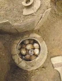 3月25日,江苏溧阳上兴镇经济开发区的一座大型土墩墓中挖出了一罐春秋时期的鸡蛋,刚发现时完好无损。 2007年,由于溧阳上兴镇经济开发区要开工建设,南京博物院和溧阳市博物馆的联合考古队进驻其间,经勘探发现开发区内共有12个文物点,其中有11个土墩墓。 土墩墓是江南一带特有的葬俗,以中心点为圆心,向外扩张,葬整个大家族,至今已经发现了上万座。 据了解,上兴镇的土墩墓目前已经发掘多座,发现鸡蛋的这个土墩墓名为子午墩。考古专家从去年3月进驻,已经考古了一年。在这里考古专家发掘了38座西周到春秋时期的墓葬,在第五层的11号墓中清理出了一罐鸡蛋。 鸡蛋被放在一个陶罐里,满满当当,尽管2500多年过去了,但罐子里的鸡蛋只破了一个,其他的都非常完好。为了防止被破坏,装鸡蛋的罐子还有盖子盖着。专家称,其实这罐鸡蛋刚发现时完好无损。 这是腌制的鸡蛋?还是新鲜的鸡蛋? 南京博物院考古研究所所长林留根介绍说,鸡蛋里的蛋清、蛋黄已经没有了。不过,通过实验,可以知道鸡蛋的“蛋龄”,也可以知道它们是不是腌制的。据了解,这是江南土墩墓发现的第五罐鸡蛋,也是迄今为止最完整的一罐。他们将把鸡蛋取回实验室,进行研究。 (来源:人民日报公众号)