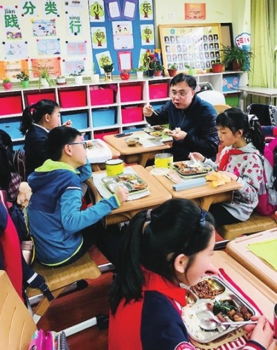 “怎么会有校长坐到我们班级里来吃午餐?”如果和校长坐在同一张餐桌上用餐,同学们会有什么感受呢?4月1日起,上海各小学的午餐时间有些不一样外,身边也会有意外的“陪客”一起用餐。走进这些学校,感受这些新鲜事。 记者 陈思焙 “校长陪餐”初体验 4月1日中午11时50分,日新实验小学的学生下课准备吃午餐。“咦,怎么会有校长坐到我们班级里来吃午餐?”一(1)班的施语桐同学看到和他坐在同一张课桌上的沈敏校长,感到有些意外,也有些紧张。不过,看到沈校长和蔼的笑容,再看校长饭盒里的菜和自己的完全一样,施语桐很快就定下心来大口大口地吃了起来。 见校长来了,有个女生主动跑过去说:“校长,我经常会胃疼,如果太硬的菜,我会吃不下。”沈校长说:“没关系,有问题和老师提出来,另外给你打点喜欢吃的菜。”一个坐在沈校长前面的男生,其他饭菜都吃光了,唯独牛肉剩了下来。“你为什么不吃牛肉?是不爱吃吗?”“不是,我最喜欢吃牛肉了,而且学校烧的咖喱牛肉特别好吃,我喜欢把最爱吃的放到最后吃。” 此前,日新实验小学陪餐制度已试运行一周。一本陪餐记录,将同学们的喜好写得很仔细:“杭白菜学生吃得少,剩下的有点多,这个需要卫生老师多开展一些教育。”“菜饭学生们特别爱吃。”……同学们告诉记者,校长陪餐制度,让自己感觉与校长的距离更近了,同时一些不良生活习惯也被及时纠正了。 家里饭菜都“失宠”了 中午11时40分,下课铃响起,长宁区天一小学三(1)班的同学们自己动手铺好餐垫,排队取餐。班主任孙旻意老师不仅和同学们一起用餐,还告诉同学们“小蚂蚁精神”——要知勤俭,珍惜粮食,争做“光盘族”。孙老师说,“每天午餐时间,我都会到教室帮小朋友分汤,每周确保至少一次进教室陪餐。” 与学生共进午餐的制度,早在2017年3月起就在该校施行了。通过陪餐,一年后,学校从每天一种套餐改为每天两种套餐的选择。为了让同学们吃饱,每餐米饭可以少一点,搭配小块披萨、汉堡或粗粮。为了给孩子一份满意的午餐,学校和配餐公司动足脑筋,翻尽花样。家长们感慨:孩子每天回家都会说学校午餐很好吃,还有两种套餐可选。吃着这顿,盼着下顿,家里的饭菜都要“失宠”了。 >>新闻链接 按教育部、国家市场监督管理总局、国家卫生健康委员会等部门公布的《学校食品安全与营养健康管理规定》,从4月1日起,中小学、幼儿园应当建立集中用餐陪餐制度,每餐均应当有学校相关负责人与学生共同用餐,做好陪餐记录,及时发现和解决集中用餐过程中存在的问题。