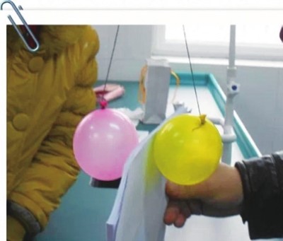 4.提起线绳的中间部位,两个气球立刻分开了。