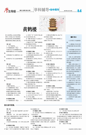 昔人已乘黄鹤去,此地空余黄鹤楼。黄鹤一去不复返,白云千载空悠悠。晴川历历汉阳树,芳草萋萋鹦鹉洲。日暮乡关何处是?烟波江上使人愁。 【第一组】 1. “乡关”的意思是_______________。 2.下列理解错误的一项是:( ) A.首联引述了有关黄鹤楼的传说。 B.颔联流露出诗人对岁月流逝的感慨。 C.颈联描绘了诗人登楼所见江上美景。 D.诗歌抒发了诗人旅途劳顿的愁绪。 【第二组】 1. “历历”的意思是________________。 2.下列理解恰当的一项是:( ) A.首联直接表明了此楼临江而建的特点。 B.颔联描绘了黄鹤楼的近景。 C.颈联写出江上景色凄美动人,令人伤感。 D.尾联表露了烟波江上日暮怀归之情。 【第三组】 1.“萋萋”的意思是_________________。 2.下列理解错误的一项是:( ) A.首联融入仙人乘鹤的传说。 B.颔联写远眺所见阔大的画面。 C.颈联采用叠词来写江上美景。 D.《黄鹤楼》是一首七言绝句。 2011届黄浦二模卷: 2.下列理解错误的一项是:( ) A.首联中“空”字表现了鹤去楼空,诗人怅然若失的心情。 B.“黄鹤”两句表达了白云悠悠,岁月不再,世事茫茫的感慨。 C.叠音词“历历”“萋萋”细腻地描写了凄凉稀疏的河岸景色。 D.“日暮”两句以黄昏水雾江烟的景色映衬诗人复杂的情感。 2011届嘉定二模卷: 2.下列理解不恰当的一项是:( ) A.首联借憧憬与现实的反差,抒发诗人寂寥怅惘的感情。 B.颔联借历史上的传说,抒发诗人对岁月流逝的感慨。 C.颈联用叠词描画江上美景,抒发诗人对黄鹤楼的神往。 D.尾联以缠绵的乡愁收篇,抒发诗人对故乡的思念情怀。 2011届闸北二模卷: 2. 下列理解正确的一项是:( ) A.首联从传说落笔,在今昔变化中凸显眼前黄鹤楼的美好。 B.颔联抒发诗人对岁月流逝的感慨,也表达了对黄鹤归来的期盼。 C.颈联写登楼远眺,运用叠词突出了想象之景的美丽、可亲。 D.尾联写日暮时长江烟波浩渺,烘托出诗人越来越浓的思乡之情。 2011届虹口二模卷: 2.下列分析不恰当的一项是:( ) A.这首诗前四句表达了岁月不再、古人不可见之遗憾。 B.首联见昔人乘鹤远去之景,表达对仙去楼空的感慨。 C.颈联运用对偶的手法,表达了对故乡的追忆与憧憬。 D.这首诗后四句描写日景晚景,由此触发了思乡之情。 2012届闵行二模卷: 2.下列理解错误的一项是:() A.这首诗从楼的命名写起,借神话传说生发开去。 B.颔联承接传说,抒发岁月不再、世事茫茫之慨。 C.颈联写眼前美好的景色,传达诗人内心喜悦之情。 D.这首诗抒发了诗人漂泊异地的伤感与思乡之情。 2013届一模卷C卷: 1.“历历”的意思是_____________。 2.下列理解最恰当的一项是:( ) A.首联在仙人乘鹤的传说中表明了临江而建的特点。 B.颔联通过近景写出了耸入天际、白云缭绕的壮观。 C.颈联描摹了凄美动人的江上景色,令人无比伤感。 D.尾联流露出烟波江上日暮怀归的真切情感。 2014届松江二模卷: 6.下列句子与画线句抒发的情感相近的一项是:()。 A.随意春芳歇,王孙自可留。 B.浮云游子意,落日故人情。 C.怀旧空吟闻笛赋,到乡翻似烂柯人。 D.夕阳西下,断肠人在天涯。 7.颈联具体地描绘了一幅______________的美丽画面,反衬了作者内心的惆怅与伤感。 ■复习要点 1.文学常识:作者唐朝崔颢。 2.主题情感:抒发自己漂泊异地的伤感与思念故乡的情感。 3.内容理解:这首诗是诗人还乡途中逗留武昌所作,描写了登黄鹤楼远眺的所见所思。 首联:诗人满怀憧憬而来,却见一座寻常江楼,这种落差使人怅然若失,为乡愁作了潜在铺垫。 颔联:在楼头远望,水天相接的自然画面,烘托出黄鹤楼高耸的雄姿。诗人心境渐渐开阔,思绪插上想象的翅膀:历史和传说在眼前回放,只有乡愁割舍不断。 颈联:艳阳高照,澄空碧流,恍惚中,汉水北岸的树木化作久久思念的亲人。(比喻) 尾联:诗作以“愁”字作结,准确地表达了日暮时分诗人登临黄鹤楼的心情,又和开篇相照应。 4.写作特色: (1)取景颇具绘画美:首联写近景,颔联写远景,颈联写日景,尾联写晚景,并且景物众多,色彩缤纷,相互映衬。 (2)多用双声、叠韵、叠音词,有音韵美。 部分参考答案 【第一组】 1.故乡 2.D 分析:错在“旅途劳顿”,应是“思乡” 【第二组】 1.清楚可数2.D 分析:A错在“直接表明”;B错在“近景”,颔联的画面开阔,不是近景;C错在“凄美”和“伤感”,这里的景色比较温暖动人 【第三组】 1. 形容草木长得很茂盛 2. D 分析:应是七言律诗 2011届黄浦二模卷 2.C 分析:错在“凄凉稀疏”,“萋萋”是“茂盛”而非“凄凉”,“历历”是“清楚可数”而非“稀疏”,河岸景色应是温暖动人的 2011届嘉定二模卷 2.C 分析:错在“抒发诗人对黄鹤楼的神往”,应是“对故乡的思念” 2011届闸北二模卷 2.D 分析:A错在“凸显眼前黄鹤楼的美好”,应是在落差中引起诗人怅然若失的情感;B错在“也表达了对黄鹤归来的期盼”;C错在“想象之景”,应是眼前所见的实景 2011届虹口二模卷 2.B 分析:错在“见昔人乘鹤远去之景”,这只是传说,不可能眼见 2012届闵行二模卷 2. C分析:错在“传达诗人内心喜悦之情” 2013届一模卷C卷 2.D 分析:A错在传说不能表明楼是临江而建的;B错在颔联是写立于黄鹤楼上远眺所见的江景,并非近景,也并非写楼之壮观;C错在“凄美”和“伤感”,颈联的景色是温暖动人的 2014届松江二模卷 6.D 7.晴空下草木茂盛 (本版供稿 长青学校 吕增兴)
