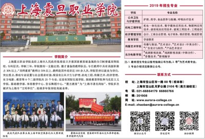 学院简介 上海震旦职业学院是经上海市人民政府批准设立并报国家教育部备案的全日制普通高等院校,专科层次,学制三年。学院拥有一支稳定的、德才兼备的教师队伍,专任教师中具有高级职称占30%以上,“双师素质”教师占50%以上,教师赴国外培训近100余人次。学院坚持以就业为导向,突出重点,推动专业设置与社会需求对接,现设有公共卫生与护理、机电工程、传媒艺术、经济管理、东方电影、教育等6个二级学院共25个专业,还设有国际交流学院、继续教育学院和马克思主义学院、基础教学部、体育教学中心、音乐舞蹈中心。“震旦教育”为“上海市著名商标”,学院多次被评为上海市“文明单位”,连续多年保持较高就业率。 联系方式 校址:上海市宝山区市一路88号(校本部) 上海市宝山区月罗公路2106号(美兰湖校区) 电话:021-66864179 66860766 邮编:201908 网址:www.aurora-college.cn E-mail:zhaoban@aurora-college.cn